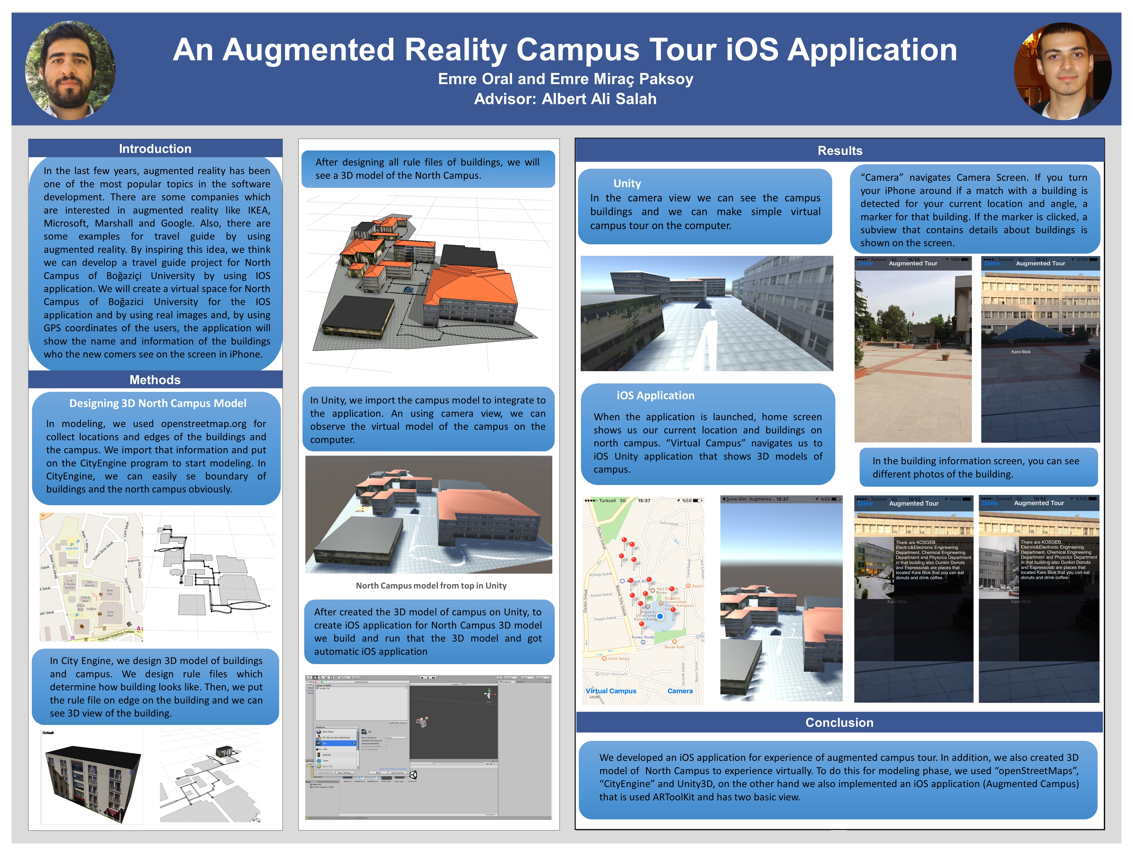 We implemented an augmented reality campus tour application for iPhone. Also, we use some tools to design an 3D view of the campus. First of all we get 2D model of the campus from the “openstreetmap.org”. We get the gps location of each length of buildings and the campus itself in 2D view. By using them, we design the 3D model in CityEngine. In CityEngine, we design each building model one by one. To design more realistic buildings, we use real photos of the building to show walls of buildings in campus. Then, we create shapes of all buildings and pyramid in the
