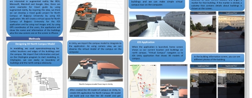 center of the campus. The final step of creating 3D model of campus is importing campus 3D model on Unity for using in iOS application because Unity is supported for iOS. For our AR iOS application, we used accelerometer, gyroscope, camera and location services of iPhone and for AR functionality of CameraViewController we used ARToolKit for iPhone. As a result, we implemented working AR Campus Tour application for North Campus, but VR Tour for iOS application need some future work.