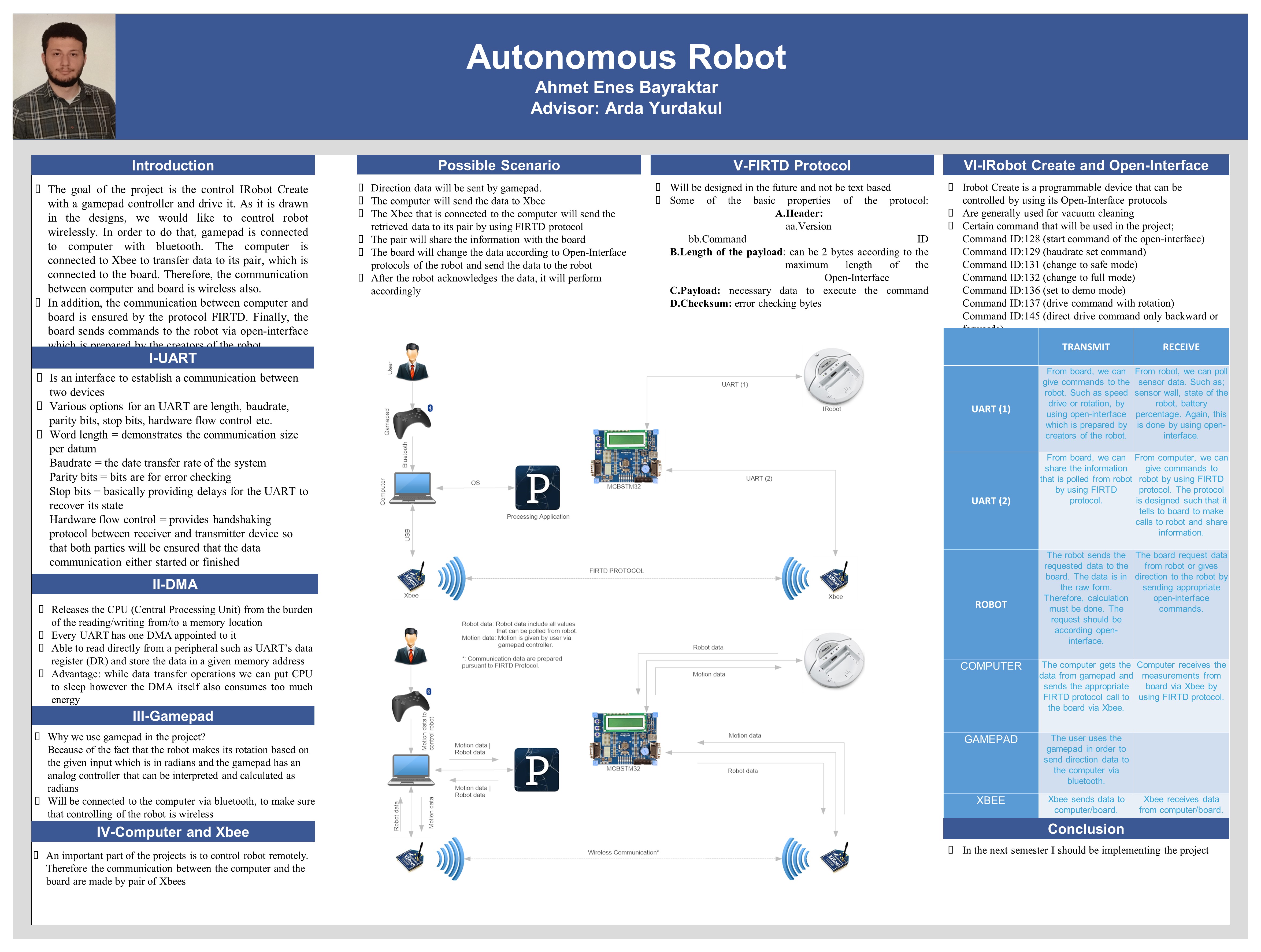 The goal of the project is the control IRobot Create with a gamepad controller and drive it. As it is drawn in the designs, we would like to control robot wirelessly. In order to do that, gamepad is connected to computer with bluetooth. The computer is connected to Xbee to transfer data to its pair, which is connected to the board. Therefore, the communication between computer and board is wireless also. In addition, the communication between computer and board is ensured by the protocol FIRTD which will be designed by me. Finally, the board sends commands to the robot via open-interface which is prepared by the creators of the robot.