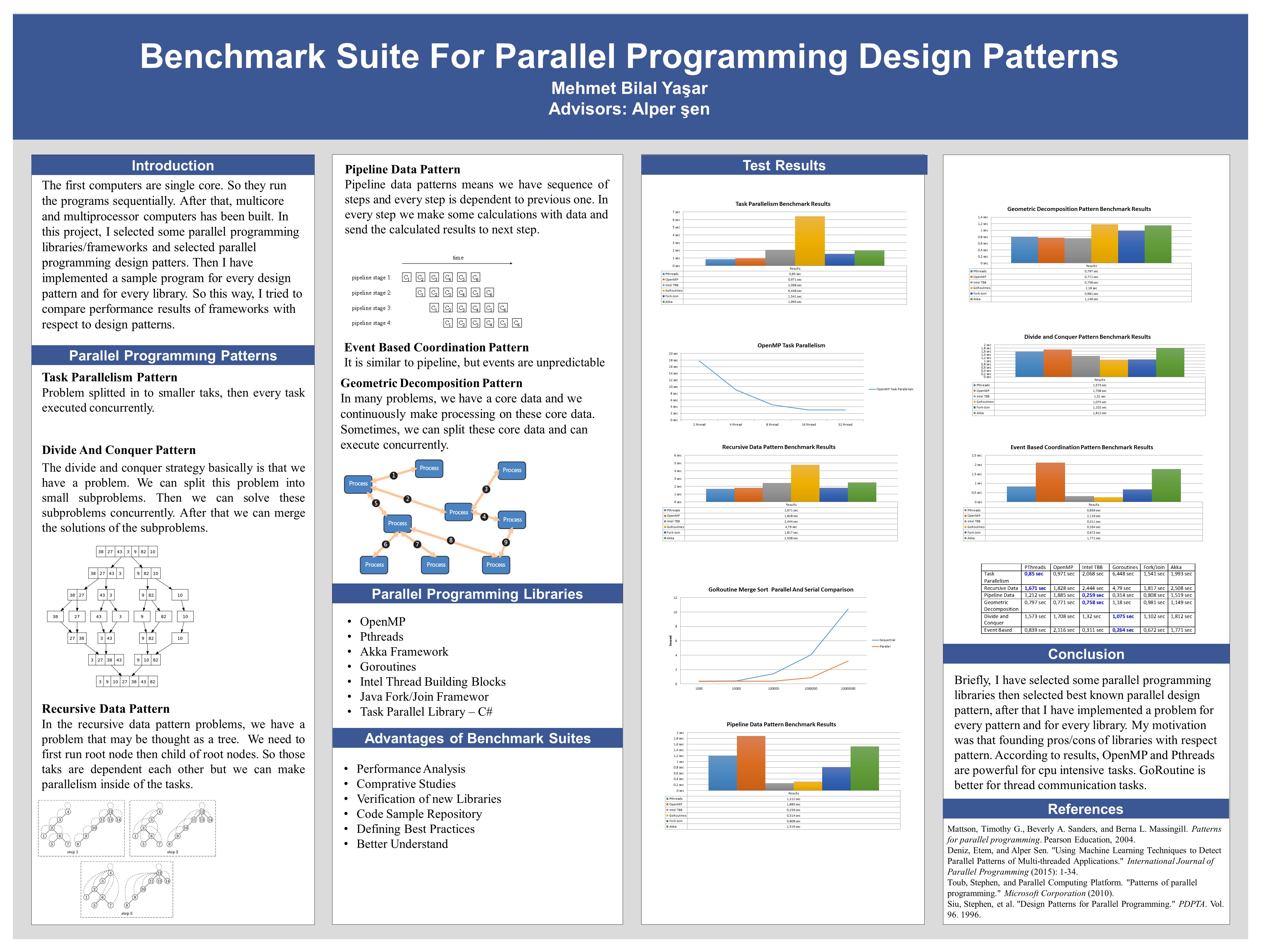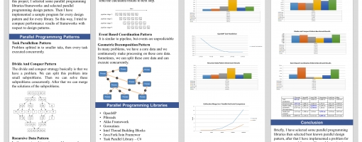 In this project, I selected some parallel programming libraries/frameworks and selected parallel programming design patters. Then I have implemented a sample program for every design pattern for every library. So this way, I tried to compare performance results of frameworks with respect to design patterns.