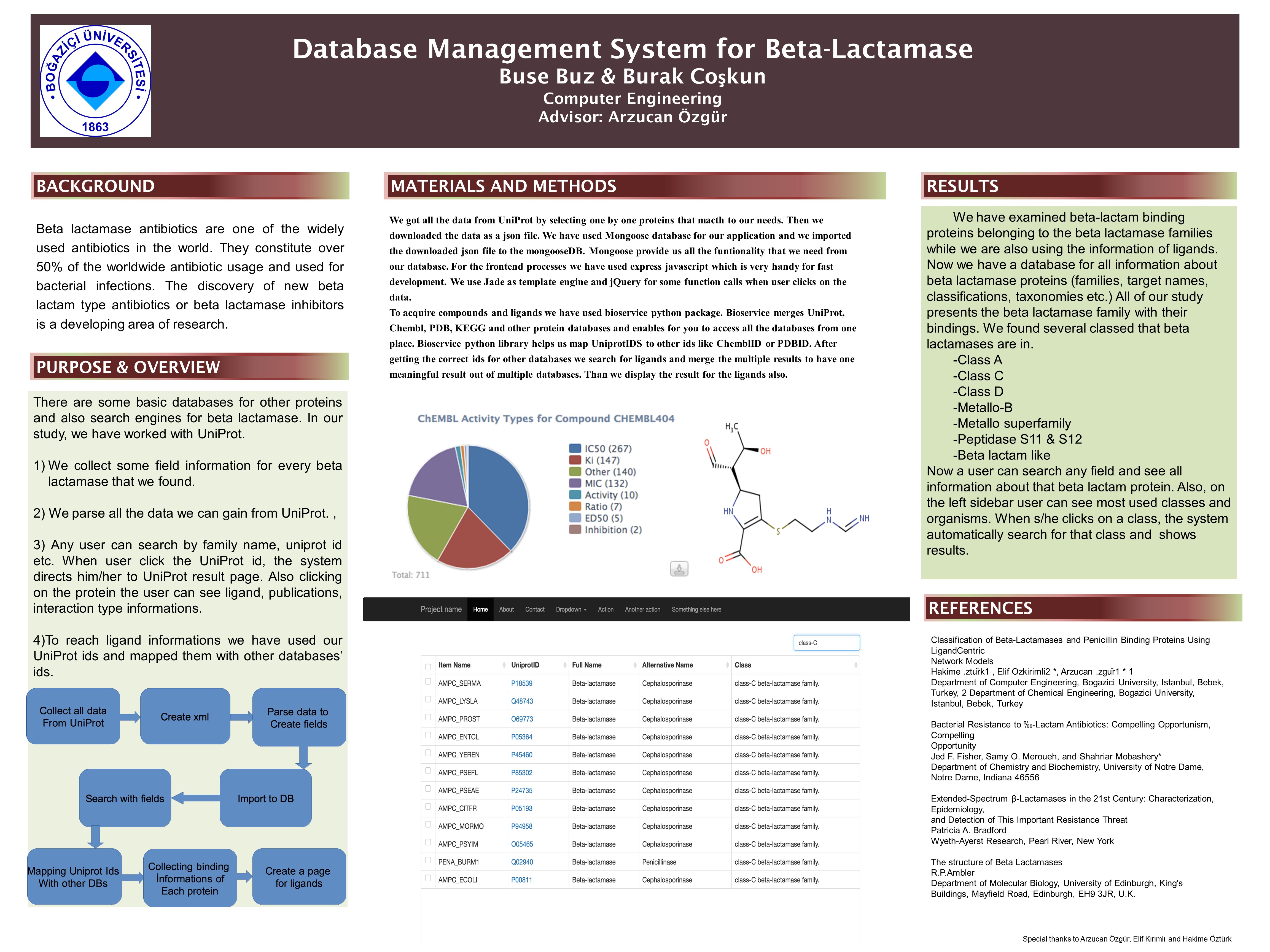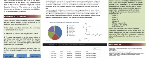 Beta lactamase antibiotics are one of the widely used antibiotics in the world. They constitute most of the worldwide antibiotic usage and used for bacterial infections. Antibiotic resistance of bacterial organisms is an important health issue if we think about today’s world. Our aim is to check all the information about beta lactamase on the internet and journals, and retrieve all data to create our database system which you can easily search proteins, inhibitors and ligands that are related to beta lactamase enzymes.