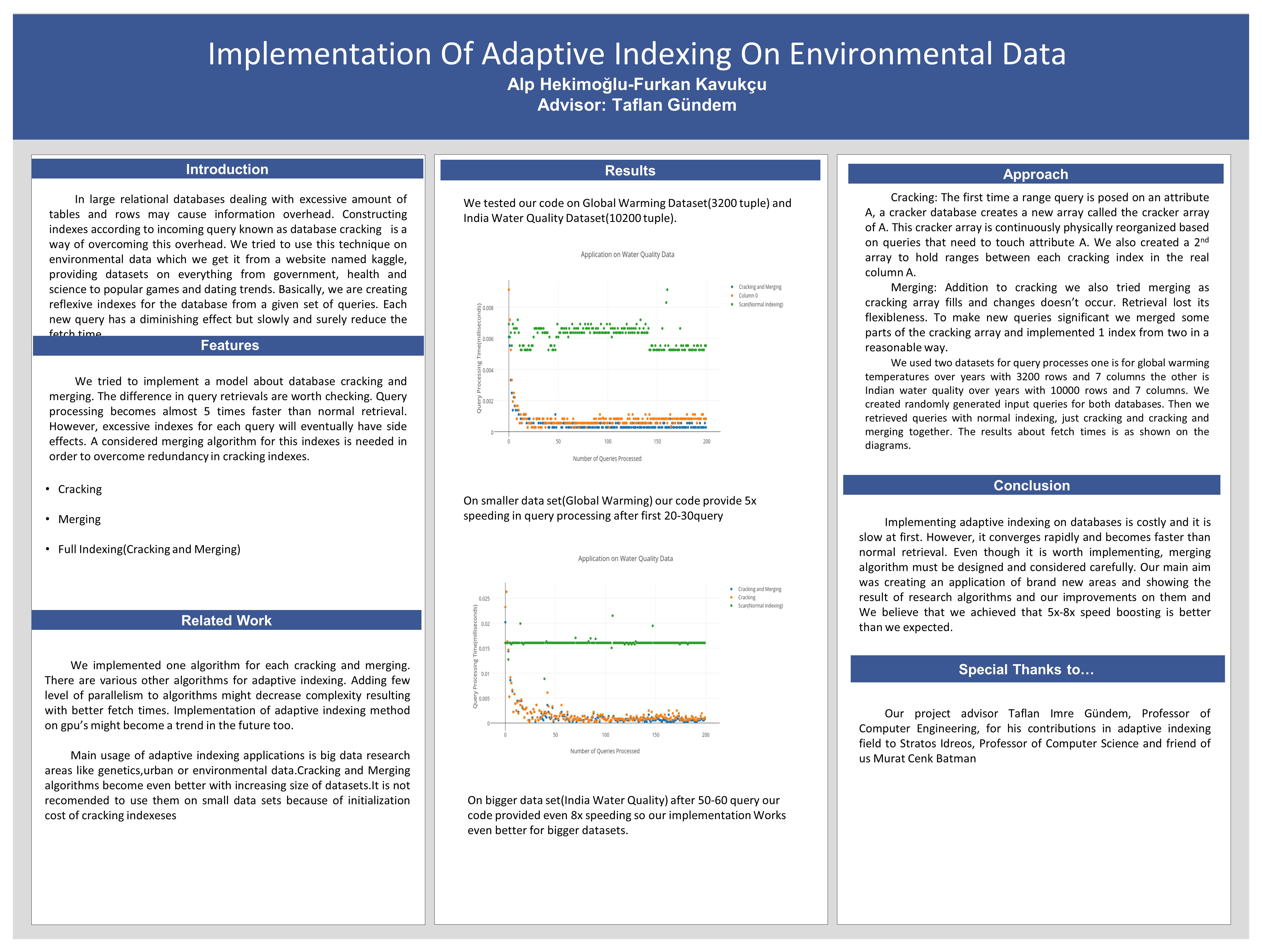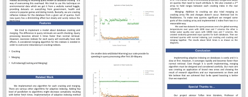 This project is about implementing adaptive indexing on environmental data. The goals of this project is understanding of database indexing, how to implement different indexing methods to databases, how query retrieval times vary in different methods and sizes.