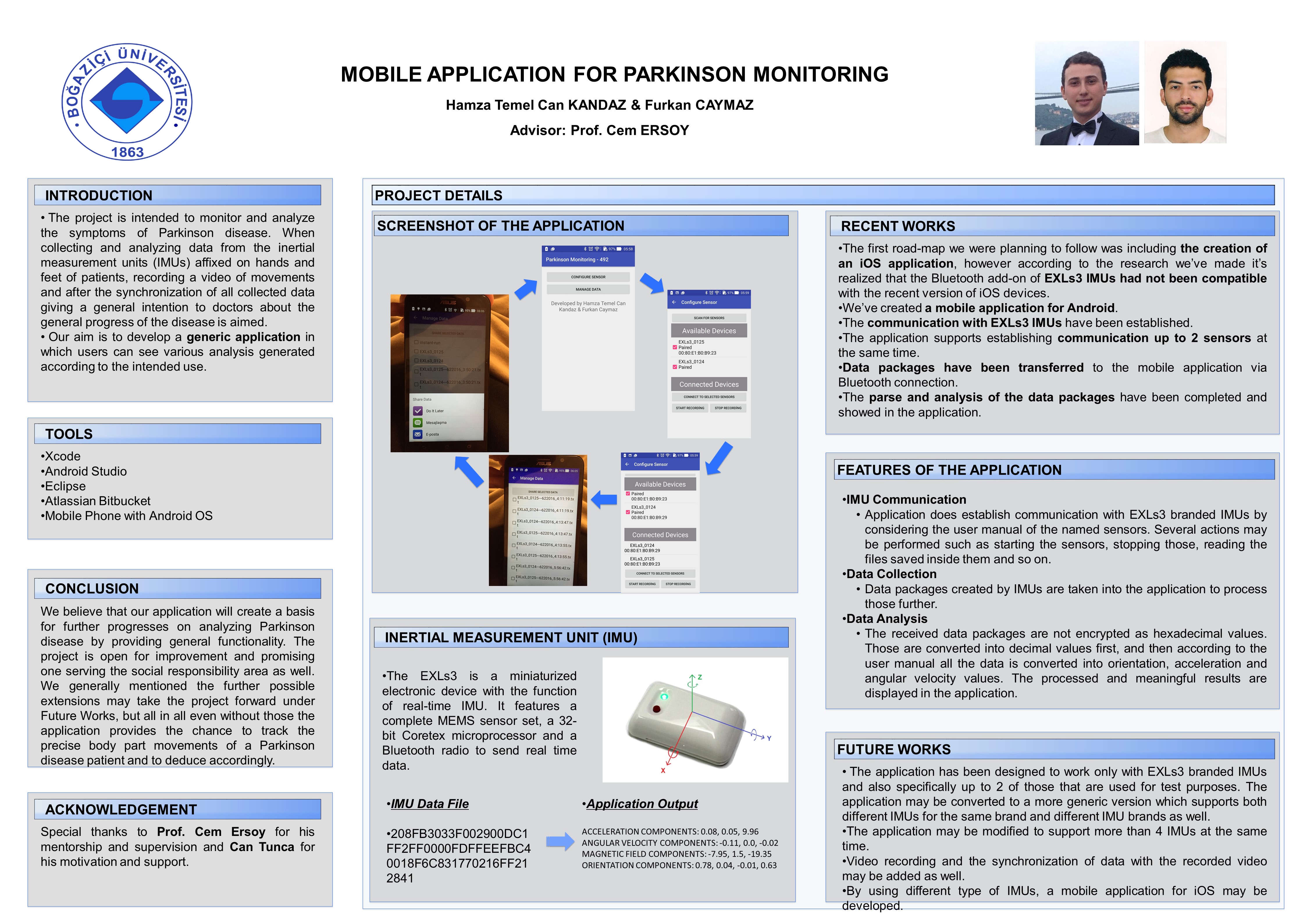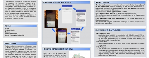 In the project Mobile Application for Parkinson Monitoring, the very beginning starting point for us was exhibiting a product that helps medical personnel and doctors to track and interpret the symptoms of a Parkinson patient better compared to old-fashioned order. For this purpose we did use EXLs3 branded inertial measurement units and a mobile application to control, parse and analyze the daily movement and trembling data of patients. At the beginning we planned to start with an iOS application, however since the IMUs we were going to use do not support low-energy Bluetooth connection as iOS provides, we couldn’t communicate with IMUs via an iOS application. The next step was doing the same with an Android application, which we did successfully. Following step was establishing a data transfer between application and IMUs, which is completed via IMU commands given in the user guide. IMU transmits data packet by packet and those packets were encoded by the producer of sensors. First we did convert those into hexadecimal values and then by using the user guideline of IMU, parsed those data and converted the parsed and finalized values to decimals. Again as an additional feature of the mobile application, user can share the parsed and logically converted data with other people and devices using different sharing options, such as messaging, e-mailing and so on.