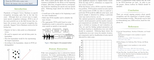 This application detects human voice in a noisy sound file. First, SVM is trained with different environments such as factory, car, river, etc. After that a noisy voice sample is given as input. Program looks first 1024 samples in noisy sample and tries to detect the environment type because at the beginning of the sample, there is only noise sound. After detection, program looks all samples according to Principal Componenet Analysis to reduce the redundancy. Then, it makes feature extraction and gets the most significant features. Finally, according to both environment sound and the rest of the file, it detects the human voice if there is any. If there is no human voice, it says there is no human voice in sound file.