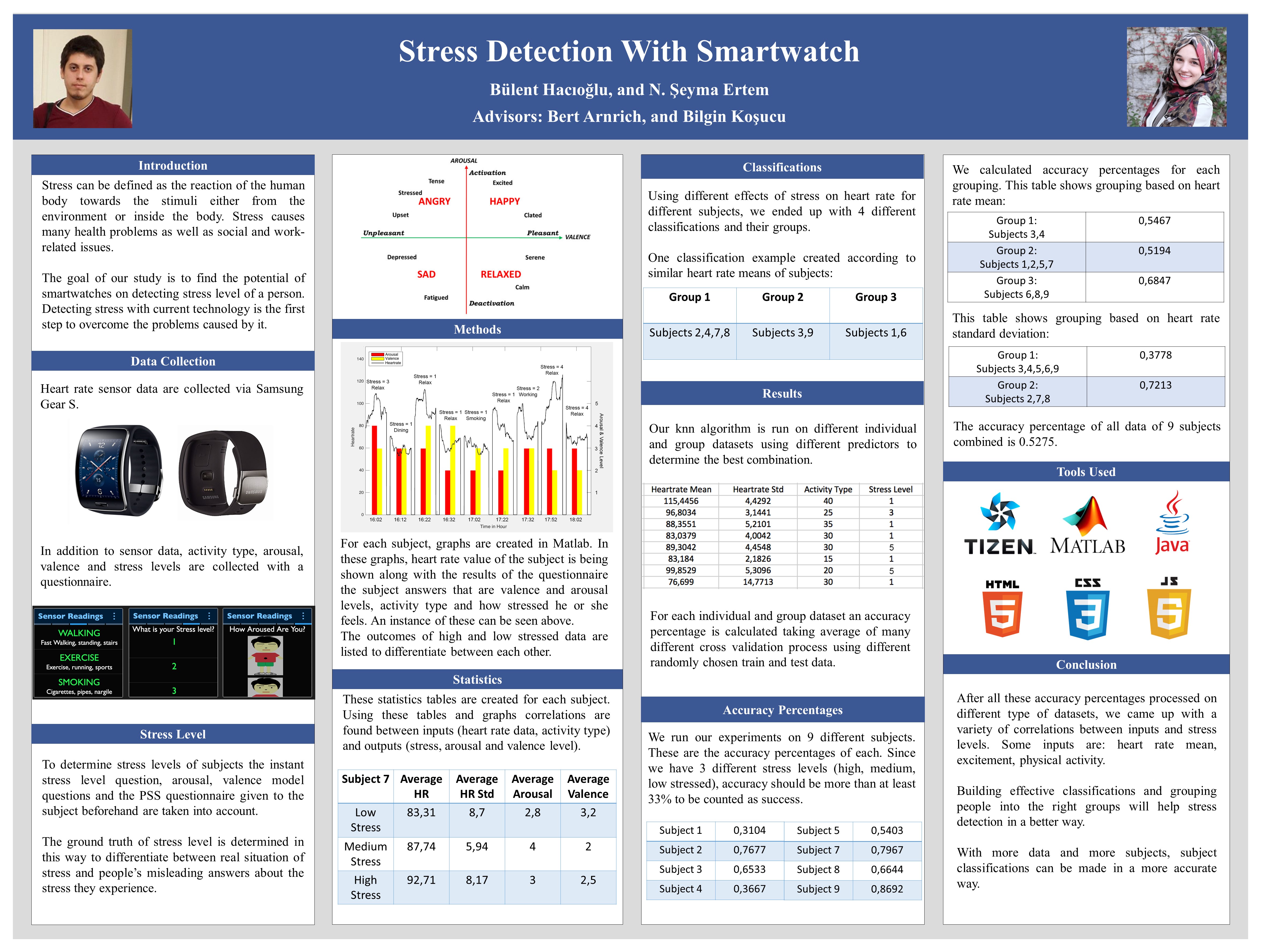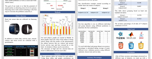 In this project, we found correlation between heart rate, physical activity and stress level. We collect sensor data for stress level from the user. In addition, user gives us input from the watch about the instant stress he or she experiences, arousal and valence values. We process the raw data and come up with statistics and graphs for each user. Then, with knn algorithm on Matlab, we find accuracy percentages for each individual subject. By analyzing all inputs we get from the user with the heart rate data, we create groups of subjects as classification. We checked each group