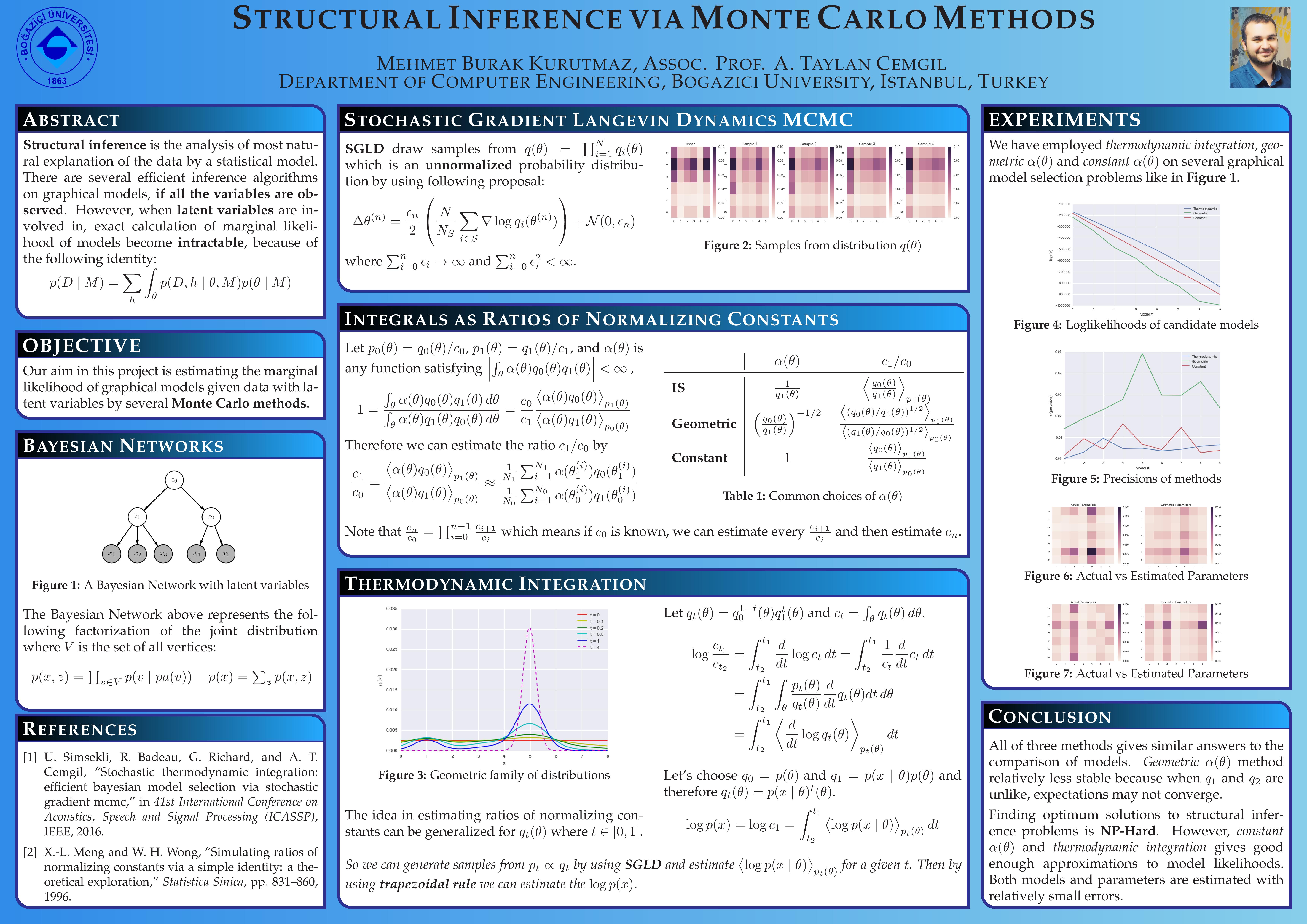 In this project, we present several algorithms that infers a Bayesian network that explains the observed data naturally (maximizing p(Model | Data)) by using Stochastic Gradient Langevin Dynamics MCMC, thermodynamic integration and generalized importance sampling. Here, we assumed that Bayesian network has a fixed graph topology and unobserved random variables (interestingly this assumption makes the model more general). Also, all the random variables comes from a categorical distrbution and the parameters of that categorical distributions are  Dirichlet distributed.