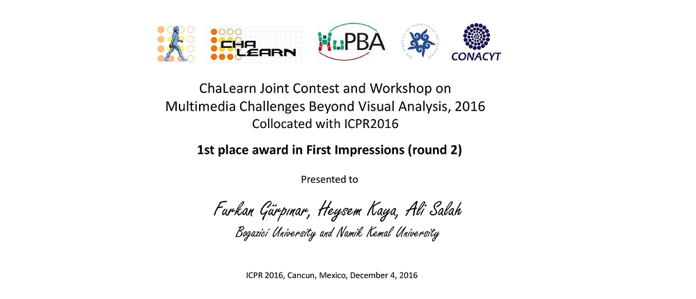 Furkan Gürpınar, Heysem Kaya, Ali Salah received 1st place award in First Impressions (round 2) in ChaLearn Joint Contest and Workshop on Multimedia Challenges Beyond Visual Analysis, 2016 (Collocated with ICPR2016).