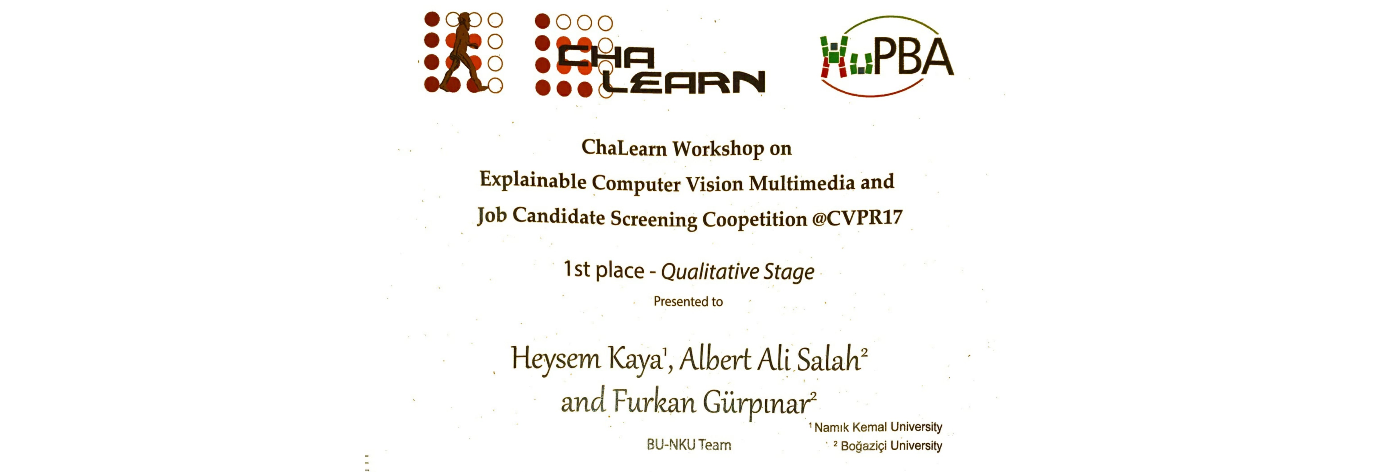 A team of researchers from the Computer Engineering Departments of Boğaziçi University and Namık Kemal University won both the qualitative and quantitative stages of the IJCNN/CVPR ChaLearn Job Candidate Screening Competition. Their designed system evaluates a short video clip from a job candidate, decides automatically whether the candidate will be invited for a job interview, and explains the reasons for the decision in plain text. The related paper was presented at the ChaLearn Workshop on Explainable Computer Vision & Multimedia at CVPR'17: