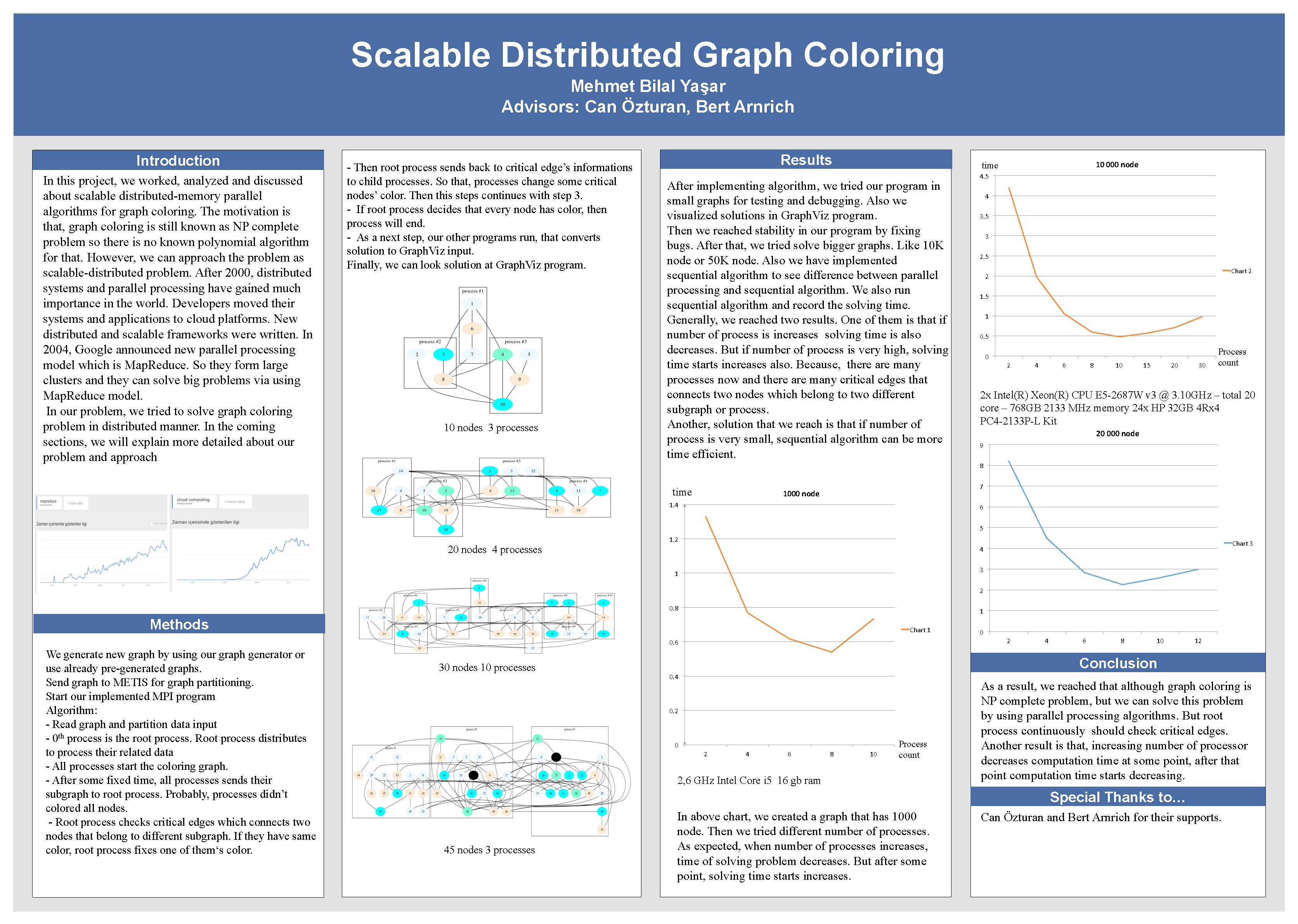 In this project we worked, analyzed and discussed about scalable distributed-memory parallel algorithms for graph coloring and matching. The motivation is that, graph coloring is still known as NP complete problem so there is no known polynomial algorithm for that. However, we can approach the problem as scalable-distributed problem. So we can color the graph with parallel processing.
