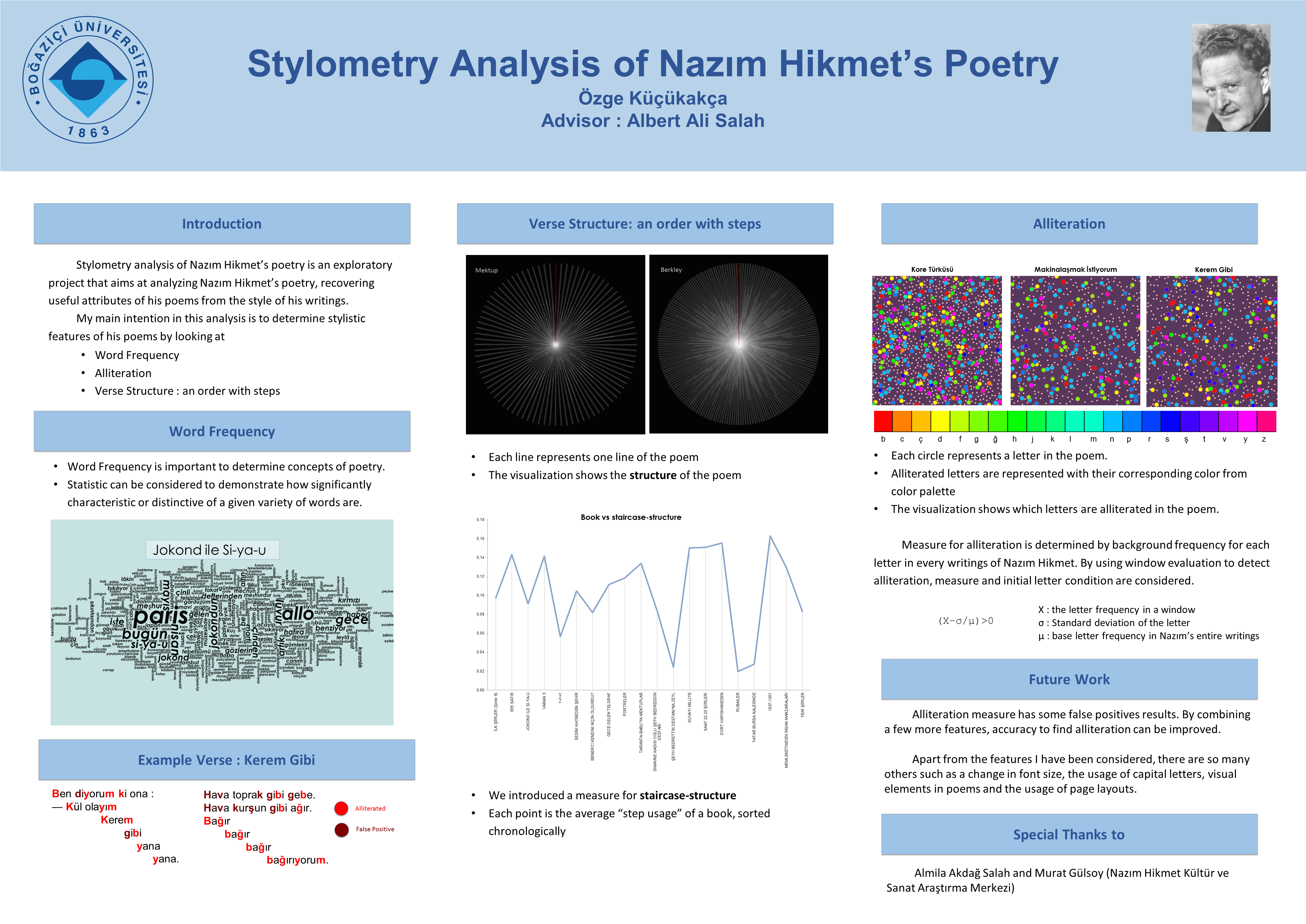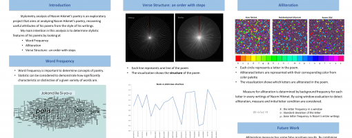 Stylometry Analysis of Nazım Hikmet’s Poetry aims at analyzing Nazım Hikmet’s poetry, recovering useful attributes of his poetries from the style of his writing. This project tries to determine the distinguishing factors on Nazım’s usage of phrase, examining the progress or change in his poetry and stylistic features of his poetry from time to time. This project is mainly focused on the word frequency, alliteration and his usage of page layout (staircase-structure) and creating graphical and visual elements for his poetry.