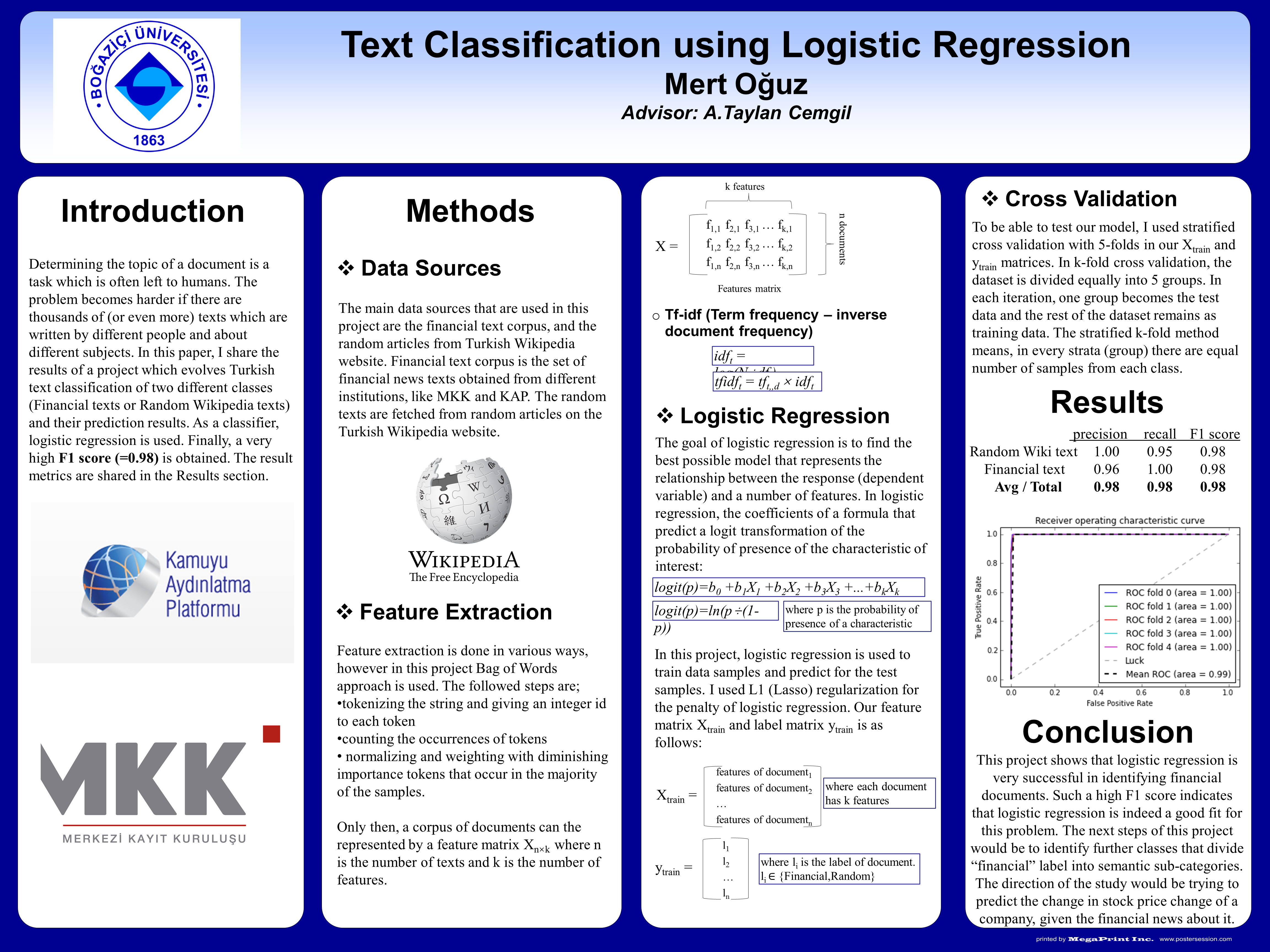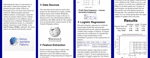 This is a project which evolves Turkish text classification of two different classes (Financial texts or Random Wikipedia texts) and their prediction results. As a classifier, Logistic regression is used. The intention of this project is to successfully identify the texts which contain financial news or data about companies from the other texts which are in random topics. The importance of the financial news documents can be understood if we look at the correlation between the stock price of a company, and the publicly published news about this company.