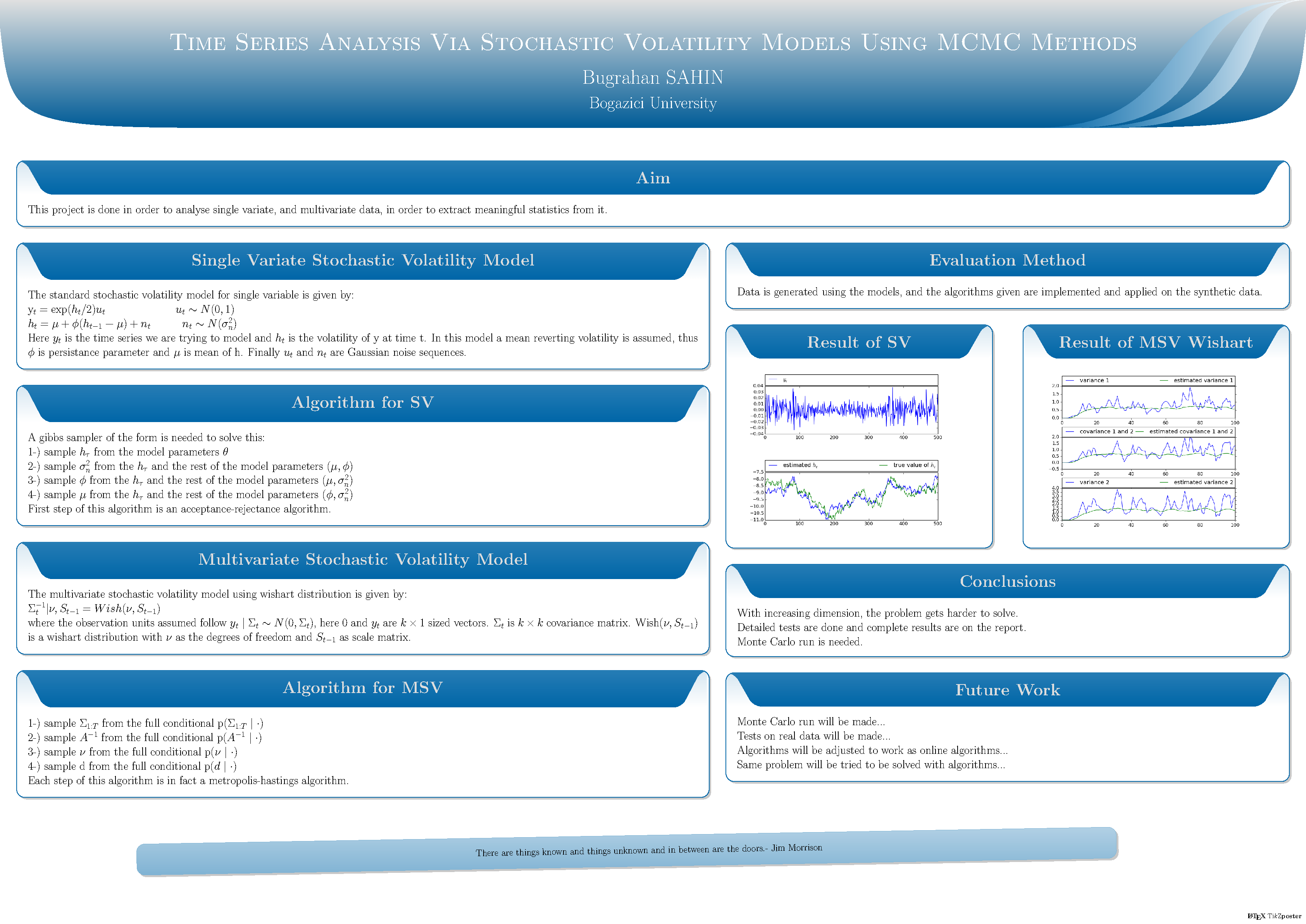 Time series analysis is used to estimate and predict behaviour of time dependent processes. In this project we have made use of two stochastic volatility models: Univariate Stochastic Volatility Model, and Multivariate Stochastic Volatility via Wishart Distribution. We estimated their parameters using combinations of MCMC methods, which are mainly Metropolis-Hastings Algorithm and Gibbs sampler. The work done gave us tools to estimate time dependent variance structure of the time series.