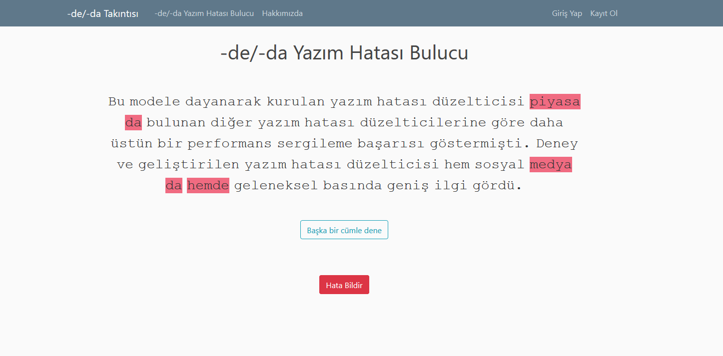 Bölümümüzden iki son sınıf lisans öğrencisi hasan.ozturkatboun.edu.tr (Hasan Öztürk) ve alperen.degirmenciatboun.edu.tr (Alperen Değirmenci) , çoğumuzun sinir bozucu bulduğu bir Türkçe yazım hatasını çözmek konusunda insanların ve sinir ağlarının davranışlarını karşılaştıran bir deneyi barındıran bir web uygulamasını yayına aldı. Araştırdığımız yazım hatası yer bildiren ve bitişik yazılan ‘-de/-da’ ekinin, "de/da" bağlacında olduğu gibi sözcükten ayrı yazılması, veya bunun tersi. Geçtiğimiz yıl, yine bir son sınıf öğrencisi tarafından bu hatanın düzeltilmesi için bir sinir modeli geliştirilmişti. Bu modele dayanarak kurulan yazım hatası düzelticisi piyasada bulunan diğer yazım hatası düzelticilerine göre daha üstün bir performans sergileme başarısı göstermişti.