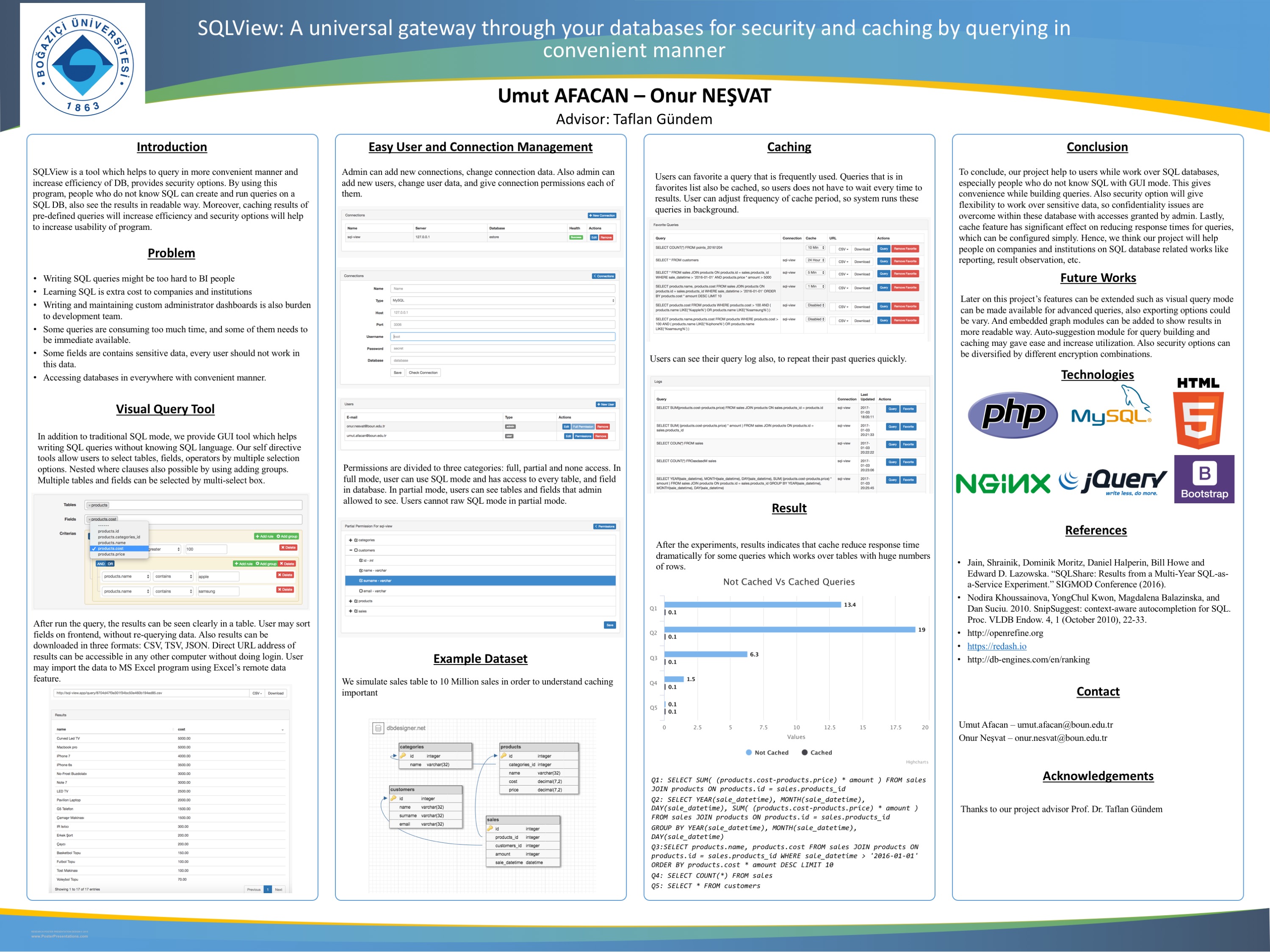 SQLView is a tool which helps to query in more convenient manner and increase efficiency of DB, provides security options. By using this program, people who do not know sql can create and run queries on a SQL DB, also see the results in readable way. Moreover, caching results of pre-defined queries will increase efficiency and security options will help to increase usability of program.
