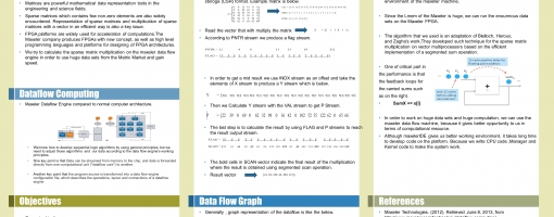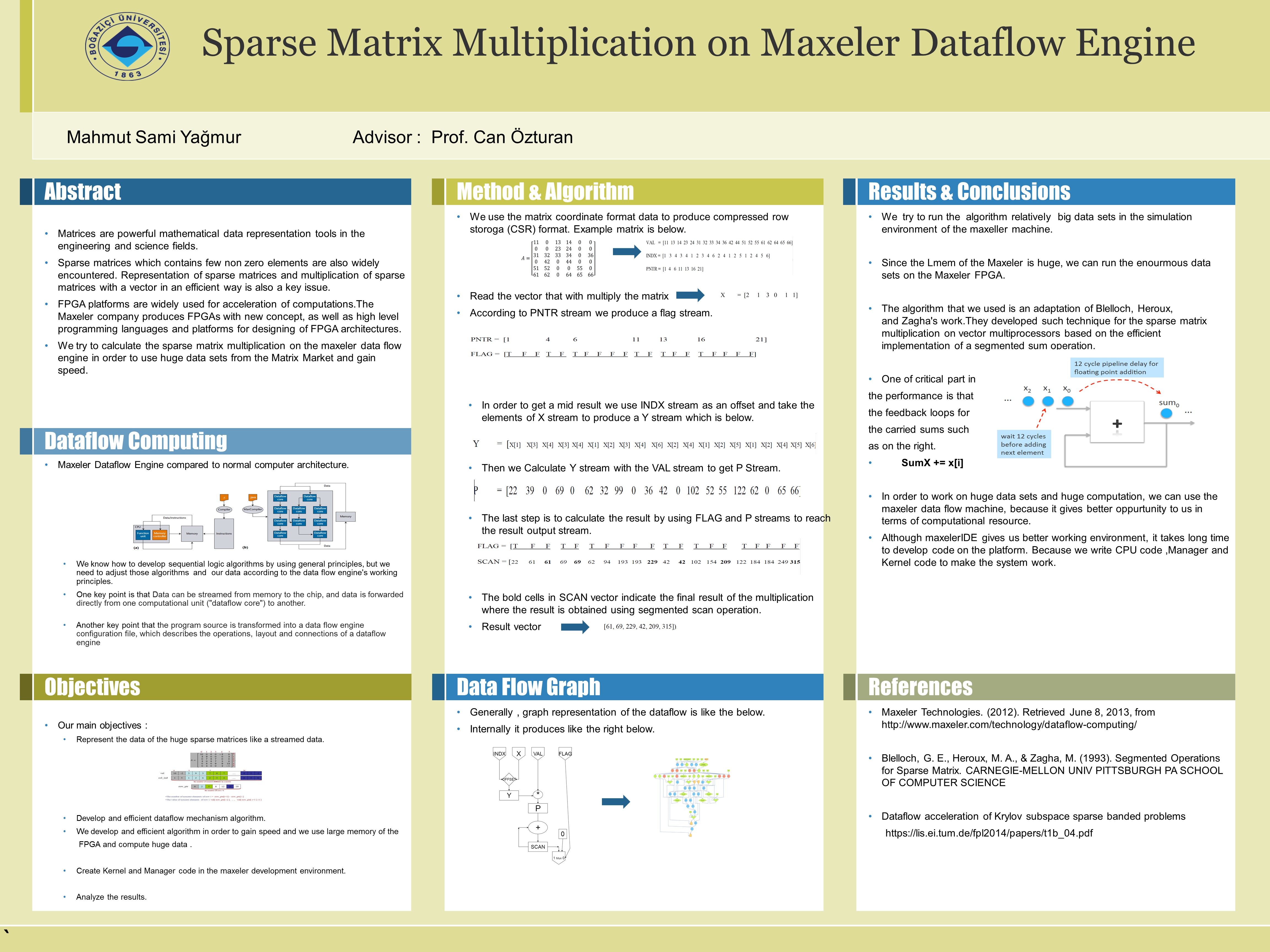 We try to calculate the sparse matrix multiplication with a vector by using the algorithm developed by Blelloch, G. E., Heroux, M. A., & Zagha, M. (1993) "Segmented Operations for Sparse Matrix" and try on the maxeler data flow engine in order to use huge data sets from the Matrix Market , gain speed and analyze the results.
