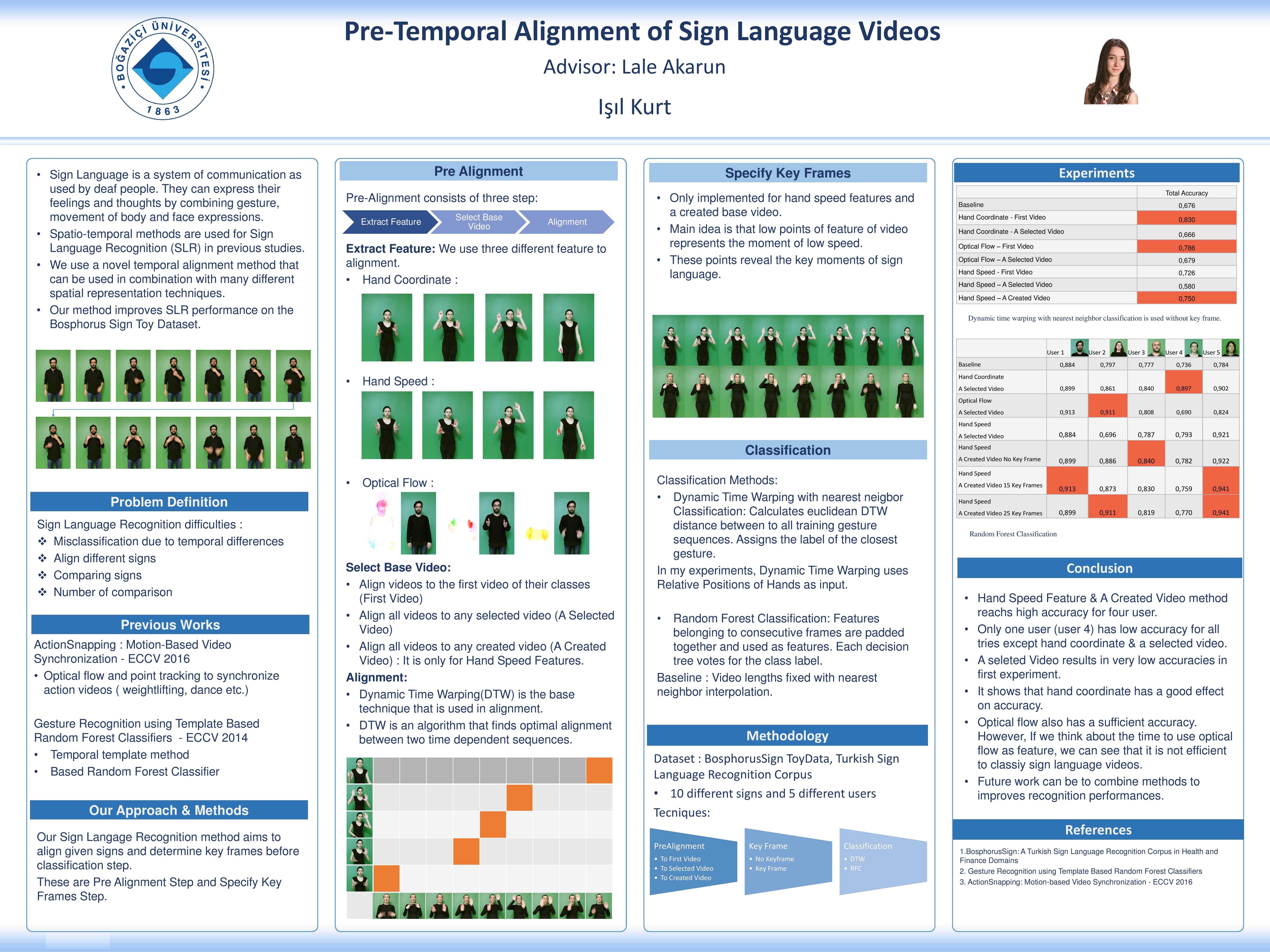 Sign language is a language which is used by deaf people. They can express their feelings and thoughts by combining gesture, movement of body and face expressions. Spatio-temporal methods are used for Sign Language Recognition (SLR) in previous studies. However, there are some Sign Language Recognition difficulties about misclassification due to temporal differences, alignment different signs or sign comparison. We use a novel temporal alignment method that can be used in combination with many different spatial representation techniques. Our Sign Language Recognition method aims to align given signs and determine key frames before classification step. To find optimal alignment between two videos, we used Dynamic Time Warping algorithm. Our method improves SLR performance on the Bosphorus Sign Toy Dataset.