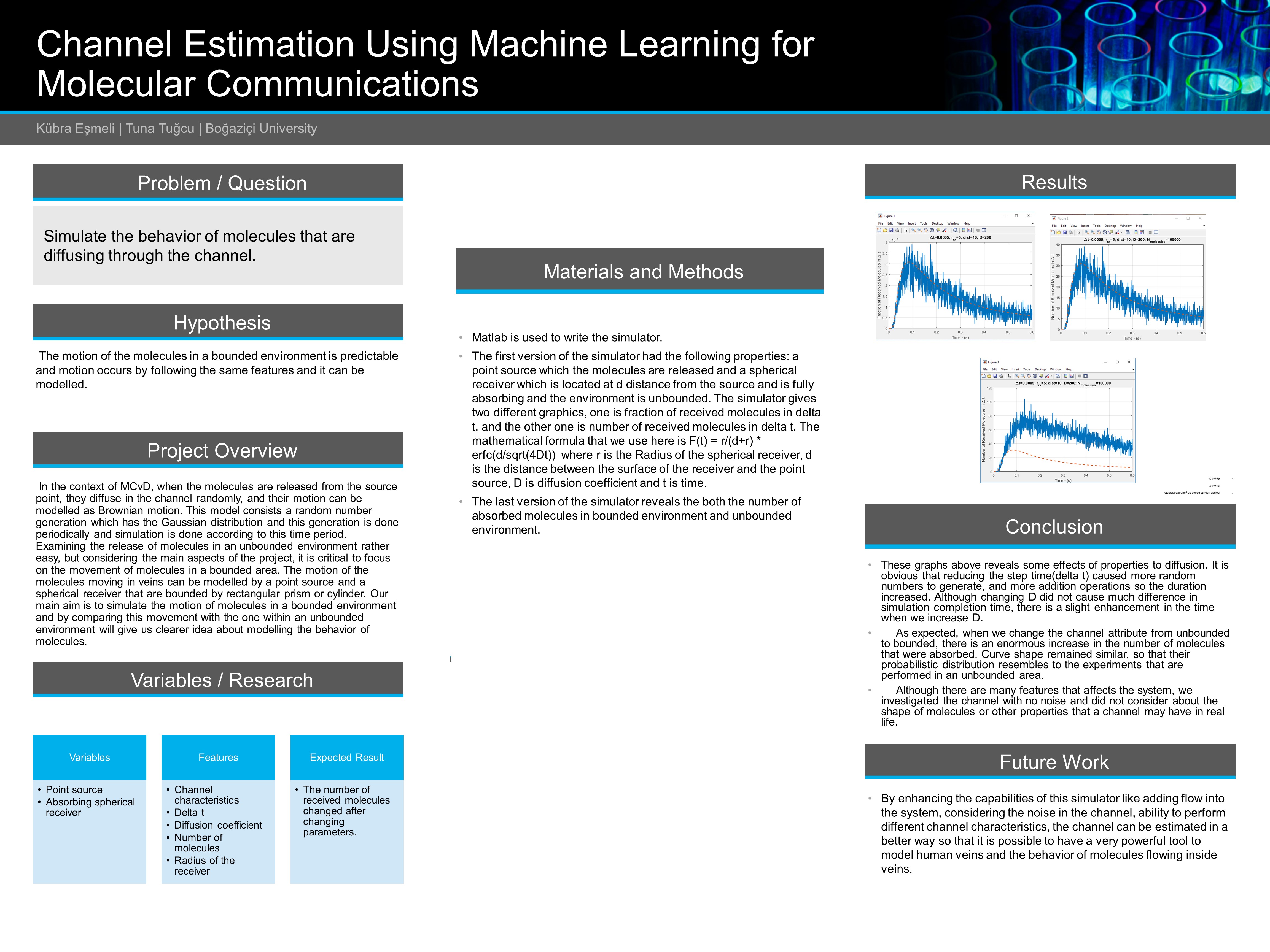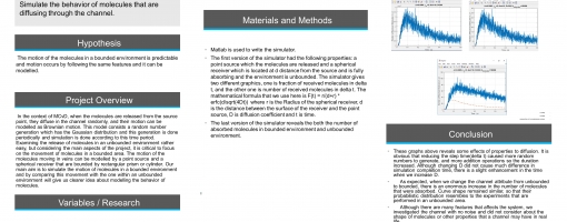In the context of MCvD, when the molecules are released from the source point, they diffuse in the channel randomly, and their motion can be modelled as Brownian motion. This model consists a random number generation which has the Gaussian distribution and this generation is done periodically and simulation is done according to this time period. Examining the release of molecules in an unbounded environment rather easy, but considering the main aspects of the project, it is critical to focus on the movement of molecules in a bounded area. The motion of the molecules moving in veins can be modelled by a point source and a spherical receiver that are bounded by rectangular prism or cylinder. Our main aim is to simulate the motion of molecules in a bounded environment and by comparing this movement with the one within an unbounded environment will give us clearer idea about modelling the behavior of molecules.