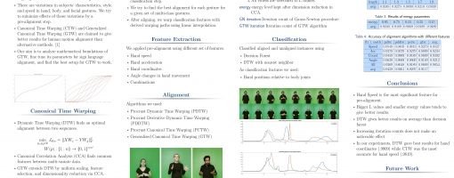In this project, we are interested with the problem of aligning features of human motions and gestures. There are variations in subjects’ characteristics, style, and speed in hand, body, and facial gestures. We try to minimize effects of those variations by a pre-alignment step. Canonical Time Warping (CTW) and Generalized Canonical Time Warping (GTW) are claimed to give better results for human motion alignment than alternative methods. Our aim is to analyze mathematical foundations of GTW, fine tune its parameters for sign language alignment, and find the best setup for GTW to work. We align gestures in an unsupervised manner before classification step. We try to find the best alignment for each gesture for a given set of multi-class gestures. After aligning, we warp classification features with derived warping paths using linear interpolation. In our experiments, DTW gave best results for hand coordinates (.9909) while CTW was the most accurate for hand speed (.9819).