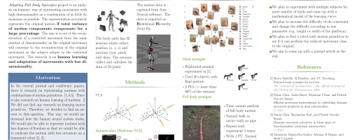 Boğaziçi University Department of Computer Engineering BSc Graduation Project (491) Fall 2017 Adapting Full Body Synergies project is an analysis on humans’ way of controlling motor movements. Instead of controlling all degrees  of freedom separately, brain tends to use combinations of \textit{motor synergies} to perform a movement, which is more efficient. After conforming this capability of humans, the synergies are extracted to perform further analysis on human learning. First,  the data from a periodic movement, walking, is collected as reference. Then, the same movement with a constraint on it is performed multiple times. In this research, the aim is to see if the synergies extracted from the restricted movement will eventually  converge to the base synergies after the subject learns how to perform the constrained version of the movement. The variances of motor primitives in novice walk converge to the original variances at the end. Further experiments will be done in the next semester.  This is an important question to tackle in order to understand how human central nervous system works in adaptation of difficult tasks.