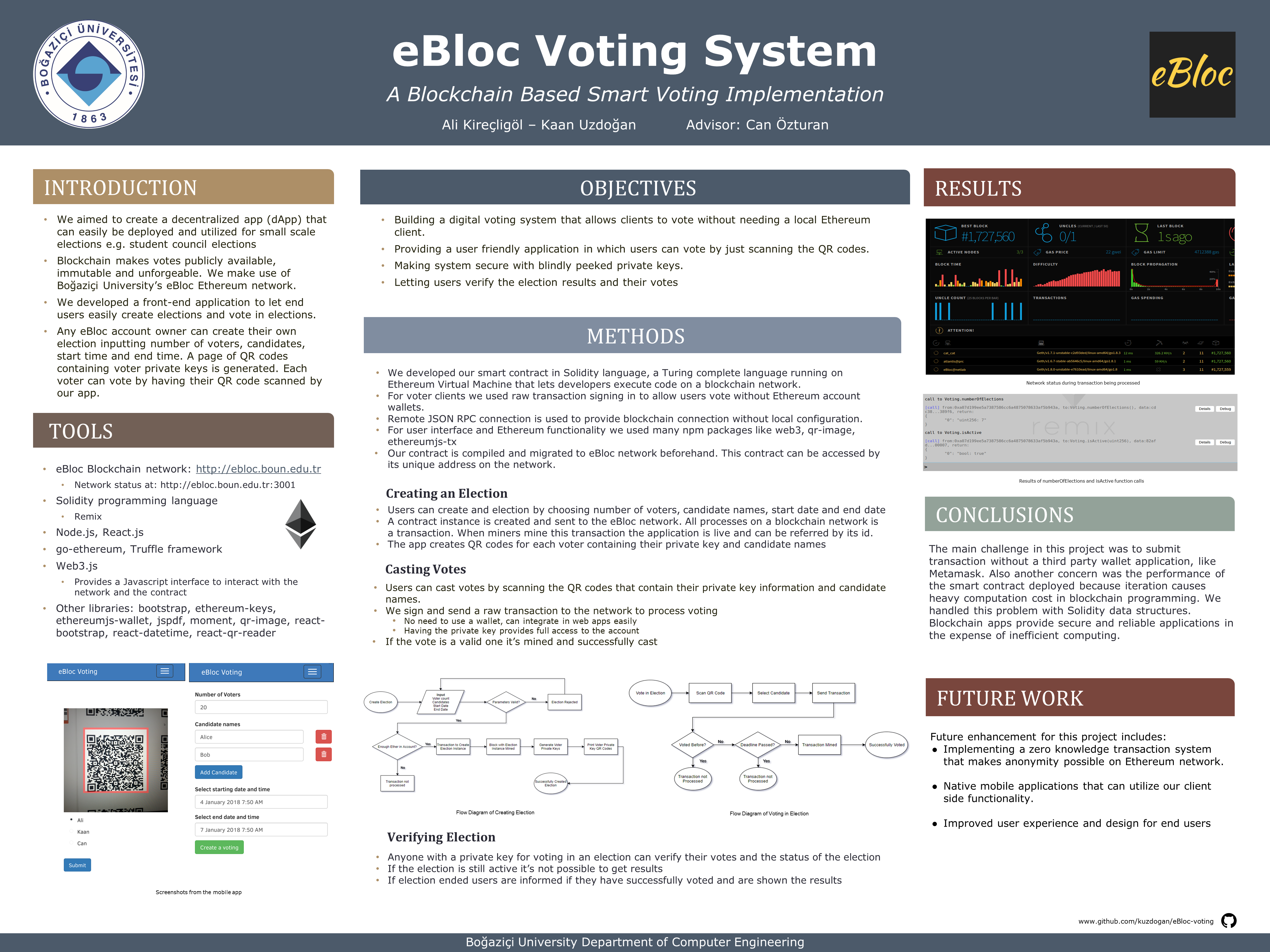 We aimed to create a decentralized app (dApp) that can easily be deployed and utilized for small scale elections e.g. student council elections using the eBloc Ethereum network of Boğaziçi University. Our system inherits the aforementioned features of blockchain applications and provides an easy to use interface that lets users easily create elections, vote in elections, verify their votes and see election results.