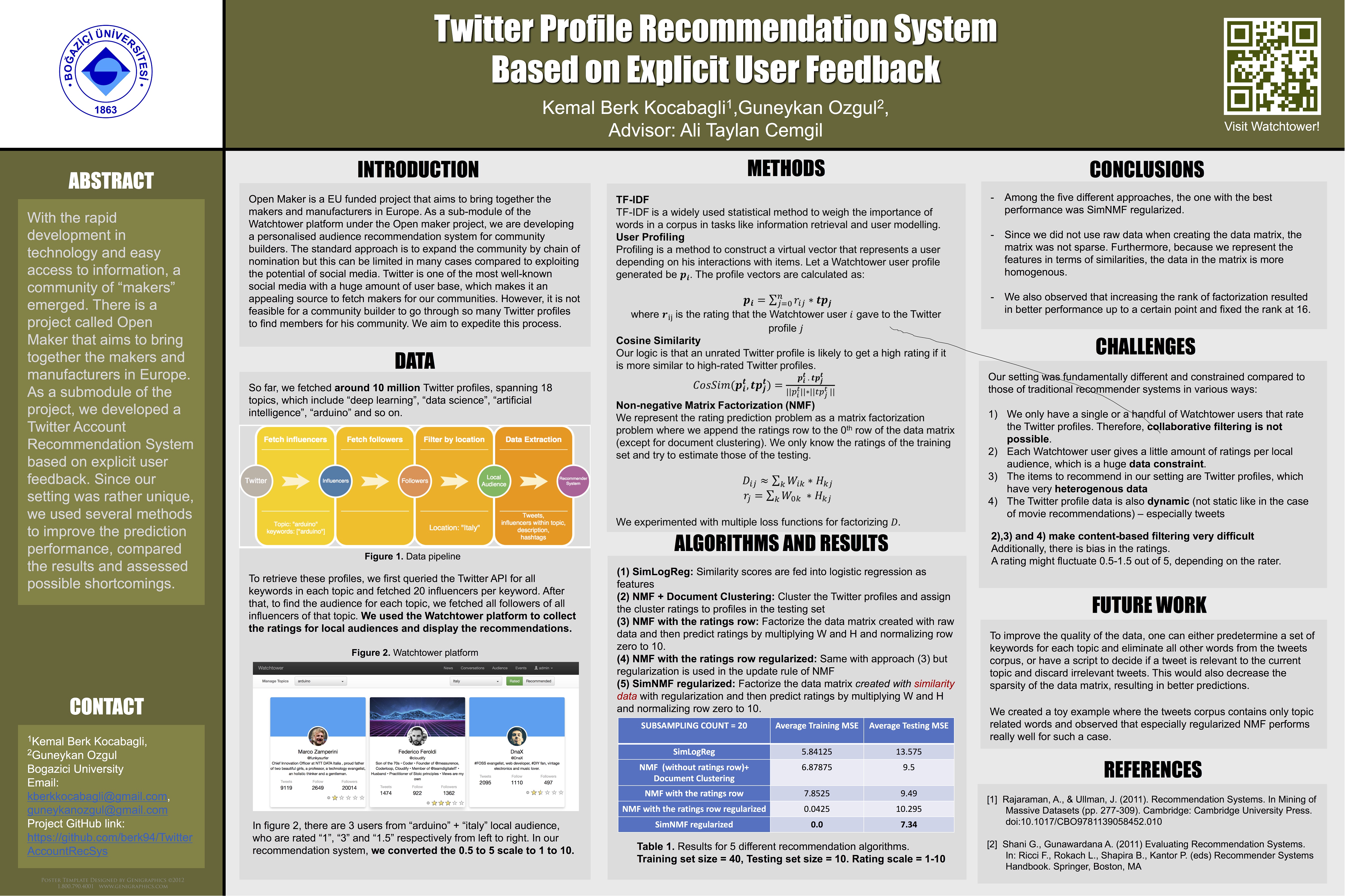 With the rapid development in technology and easy access to information, a community of “makers” emerged. There is a project called Open Maker that aims to bring together the makers and manufacturers in Europe. As a submodule of the project, we developed a Twitter Account Recommendation System based on explicit user feedback. Since our setting was rather unique, we used several methods to improve the prediction performance, compared the results and assessed possible shortcomings.