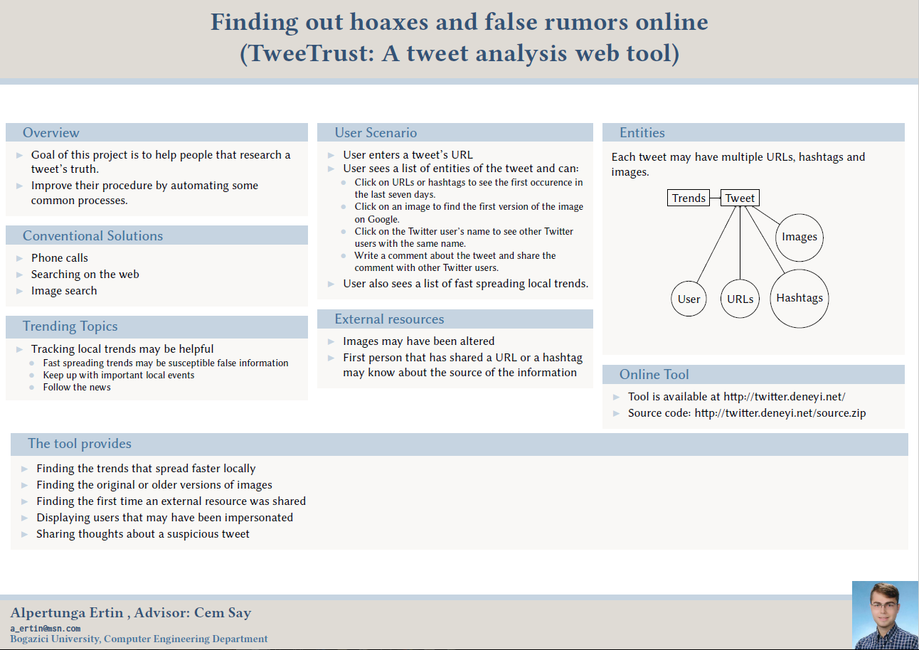 Twitter is a medium that allows information to spread very fast. It is hard to find the source of the informationg and confirm its truth. I have developed a tweet analysis web tool, TweeTrust, to find the first instance of a URL, hashtag or an image to help find the source of the information that is being spread on Twitter. The users can then comment on the validity of the information and share their thoughts. A list of fast spreading local trends also can help find the news on the home page.