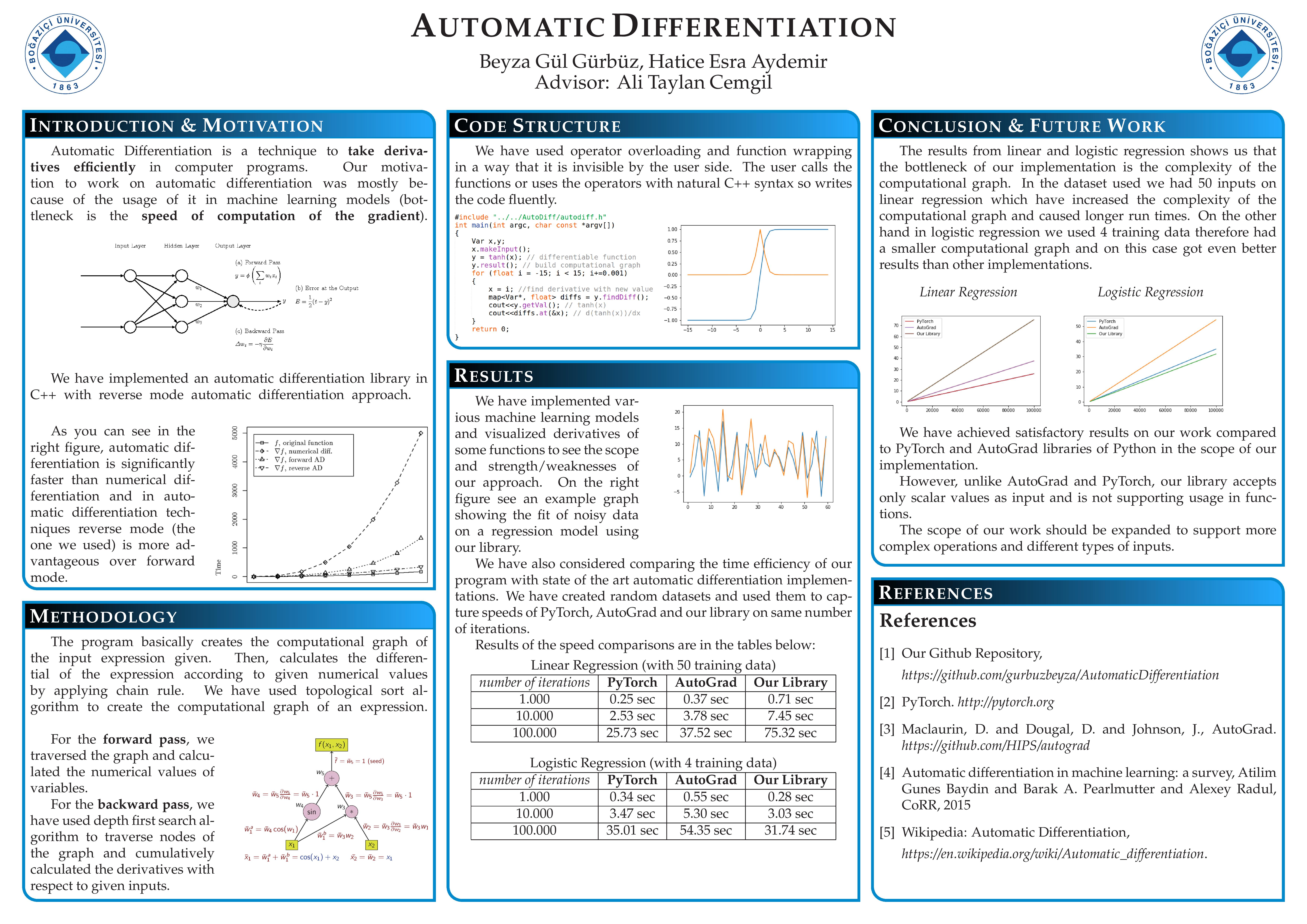 As the number of computer programs that need the gradient of functions increase, (such as machine learning programs that use gradient descent algorithms) efficient derivation of gradients problem has risen. Many machine learning / deep learning algorithms use derivations at each step. So the efficiency of the derivation matters a lot for those programs. There are three main ways to differentiate a function. On this project, we implemented automatic differentiation which is the most suitable one of these methods for our purpose of use.