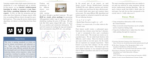 Learning complex tasks which require dexterous manipulations is a very challenging task in robotics. This issue is getting importance as robots are used in human environment and industrial areas. Solving such complex tasks needs some nontrivial sensory motor skills, but it is hard to program manually these skills. On the other hand, specifying a reward function manually for such a task is also difficult. There are so many features to consider, but even a human expert cannot easily specify these features exactly and assign them weights. So, in this project, we use inverse reinforcement learning in order to recover a cost function from a pushing behavior of a human expert. At first, we take the orientation and position data from behaviors of human experts while they are pushing different objects through the specified trajectory. Then using the inverse reinforcement algorithms, we extract a reward function from these data.