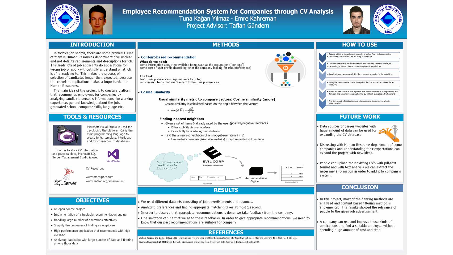 The main idea of the project is to create a platform that recommends employees for companies by analyzing candidate person’s informations like working experience, general knowledge about the job, graduated school, computer skills, language etc.