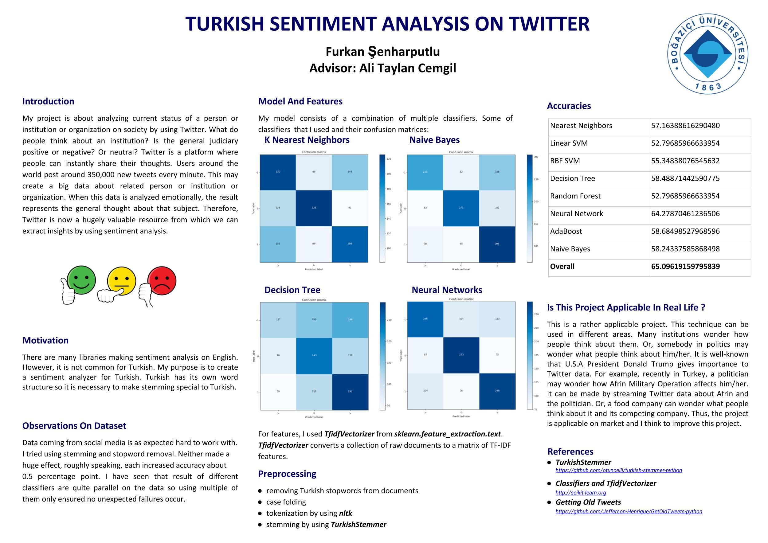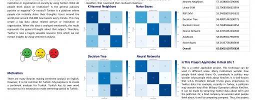 My project is about analyzing current status of a person or institution or organization on society by using Twitter. What do people think about an institution? Is the general judiciary positive or negative? Or neutral? Twitter is a platform where people can instantly share their thoughts. Users around the world post around 350,000 new tweets every minute. This may create a big data about related person or institution or organization. When this data is analyzed emotionally, the result represents the general thought about that subject. Therefore, Twitter is now a hugely valuable resource from which we can extract insights by using sentiment analysis.