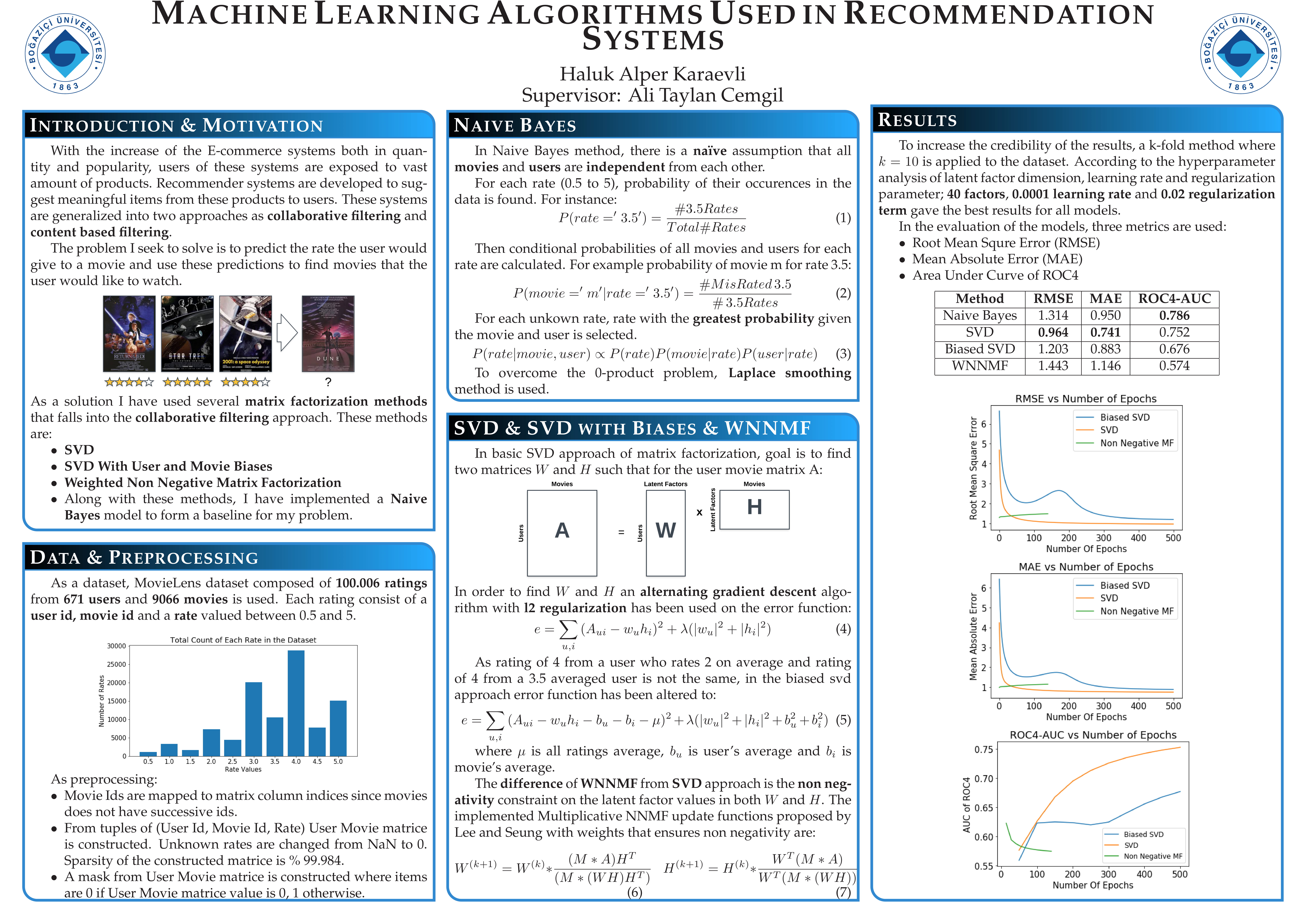 Recommendation systems help people by recommending items which suit their preferences. In collaborative filtering approach, methods recommend items to the users from other users whose past activities are similar to the recommendee users.In this project a review of collaborative filtering (cf) area on recommendation systems are given. After the review three models named SVD, Biased SVD and NNMF that are categorized under dimensionality reduction topic of model-based collaborative filtering models are implemented along with a simple naive bayes probabilistic model. The performance of the models are measured by three metrics which are RMSE, MAE and AUC. As data MovieLens 100k dataset has been used. To increase the validity of the measurements k-fold method with k = 10 has been applied to the data. According to the results of the measurements SVD gave the best results on RMSE and MAE metrics while Naive Bayes model has the best performance on AUC compared to other models.