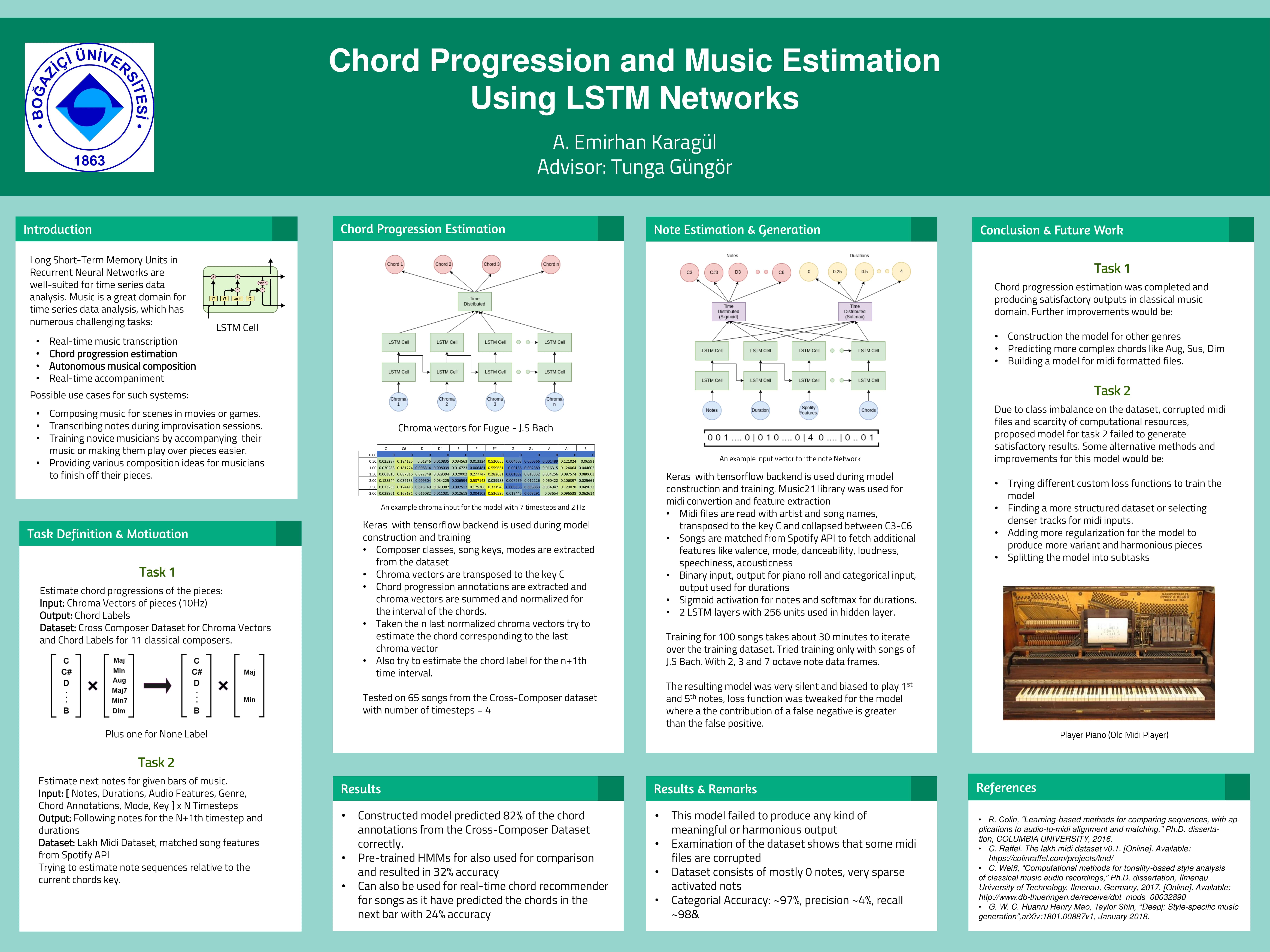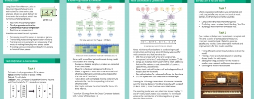Recurrent Neural Networks and Long-Short Term Memory Units have been very successful in analyzing and handling time-series data with long or short term dependencies. Music is a great domain for these methods to be practiced and applied, as it is comprised of vast amount of time-series data with all kinds of dependencies. This project aims to investigate such methods for tasks like chord progression estimation and autonomus musical composition. Such methods will be practiced on midi formatted musical files and musical data with chroma representations.
