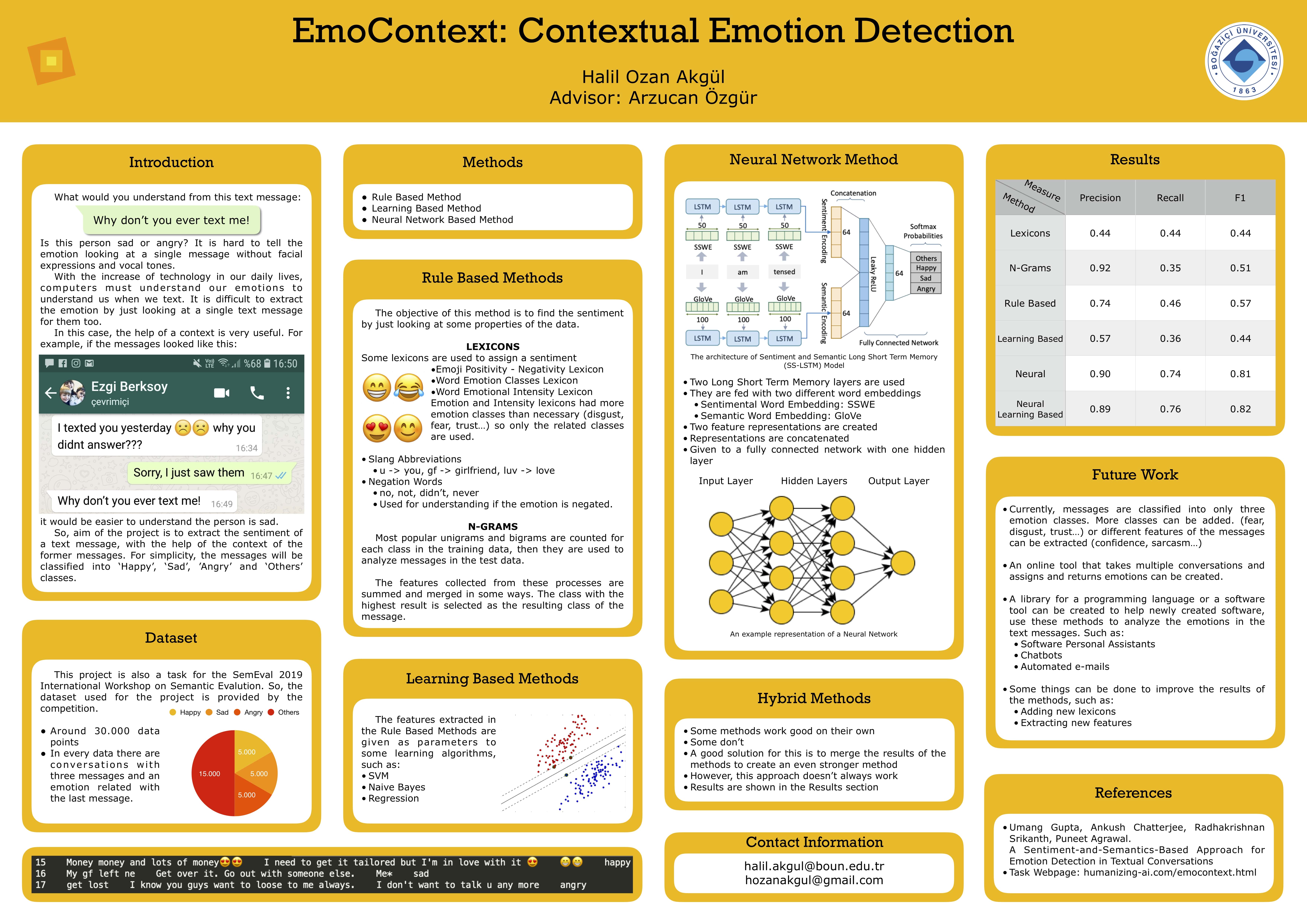With the increase in the ease of use of technology, we communicate more and more with the computers in a conversational way. Such as personal assistants in our phones, automated e-mail responders or online chatbots. To be able to communicate with us effectively computers have to understand our emotions too. However, understanding the emotion by just looking at a single message is not always enough. So, in this project, I studied the ways of detecting the emotion of a text message in the context of former messages, using rule based, learning based and hybrid methods.