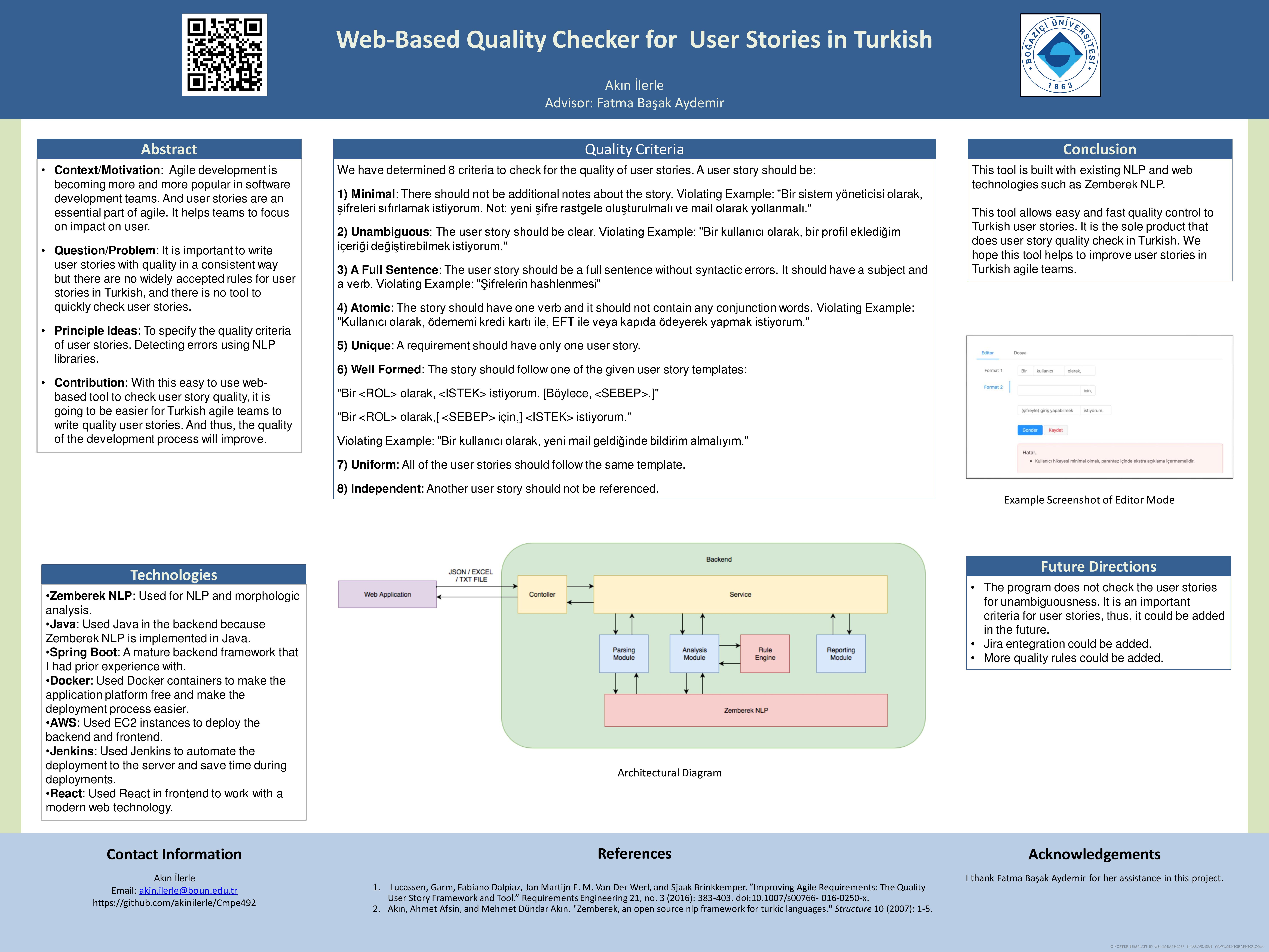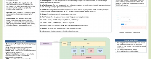 A good example of a user story is: "As an Admin, I want to review posts before they are published so that I can make sure it is complicit with our rules.". Turkish teams often struggle with the correct use of user stories because there is no widely accepted rules or a tool to check the user stories against them. This project had aimed to create a web based tool for checking the quality of user stories in Turkish.