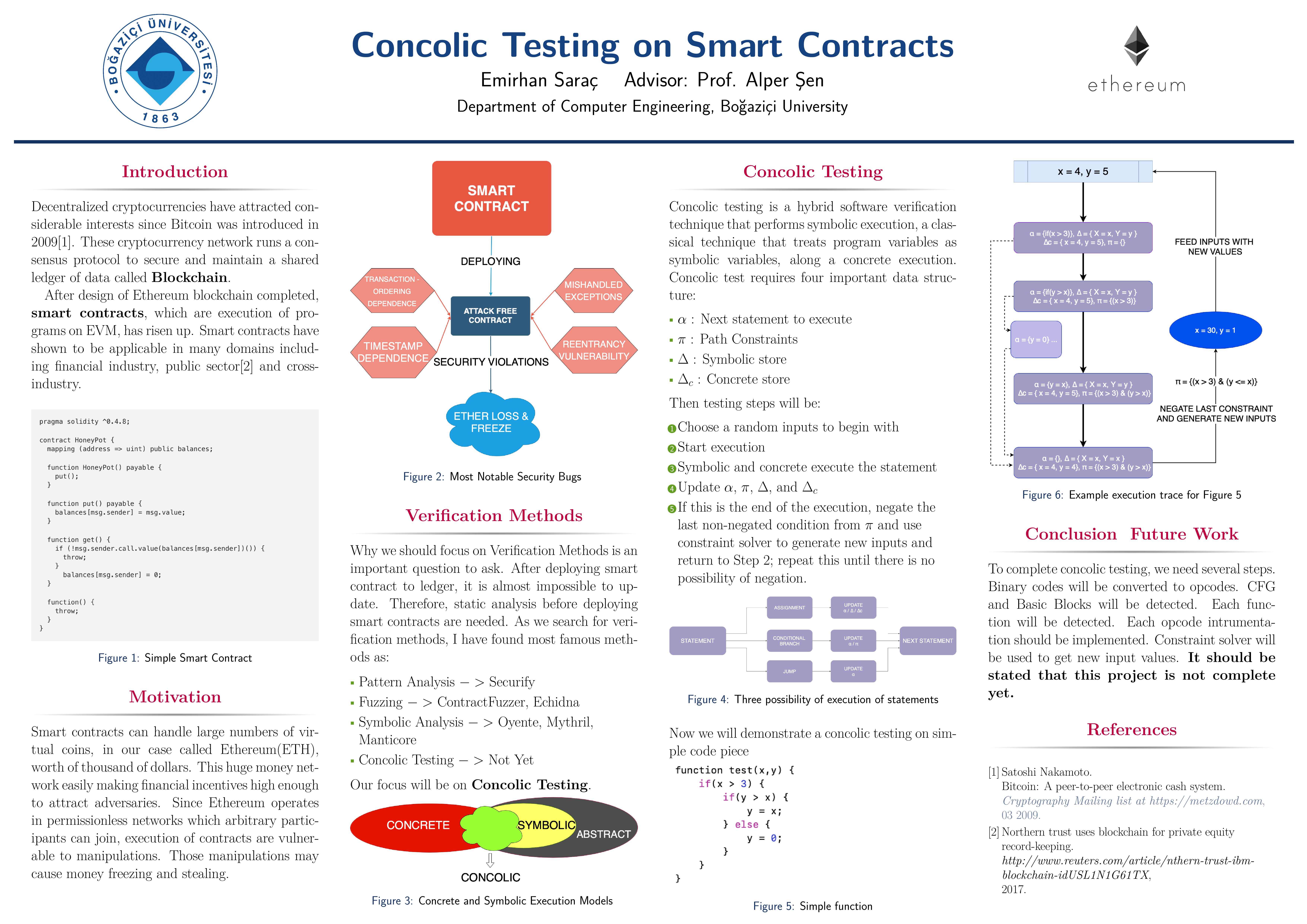 After design of Ethereum blockchain completed, smart contracts, which are execution of programs on EVM, has risen up. Smart contracts have shown to be applicable in many domains including financial industry, public sector and cross-industry. Smart contracts can handle large numbers of virtual coins, in our case called Ethereum(ETH), worth of thousand of dollars. This huge money network easily making financial incentives high enough to attract adversaries. Since Ethereum operates in permissionless networks which arbitrary participants can join, execution of contracts are vulnerable to manipulations. Those manipulations may cause money freezing and stealing. Since after deploying a smart contract to blockchain ledger, it is impossible to update it. Therefore, static analysis before deployment is required. In this project, we will take aim to develop a concolic testing engine for EVM Smart Contracts. We expect to complete a basic engine for concolic testing and catch the most famous security bugs with higher percentage compared to other tools.