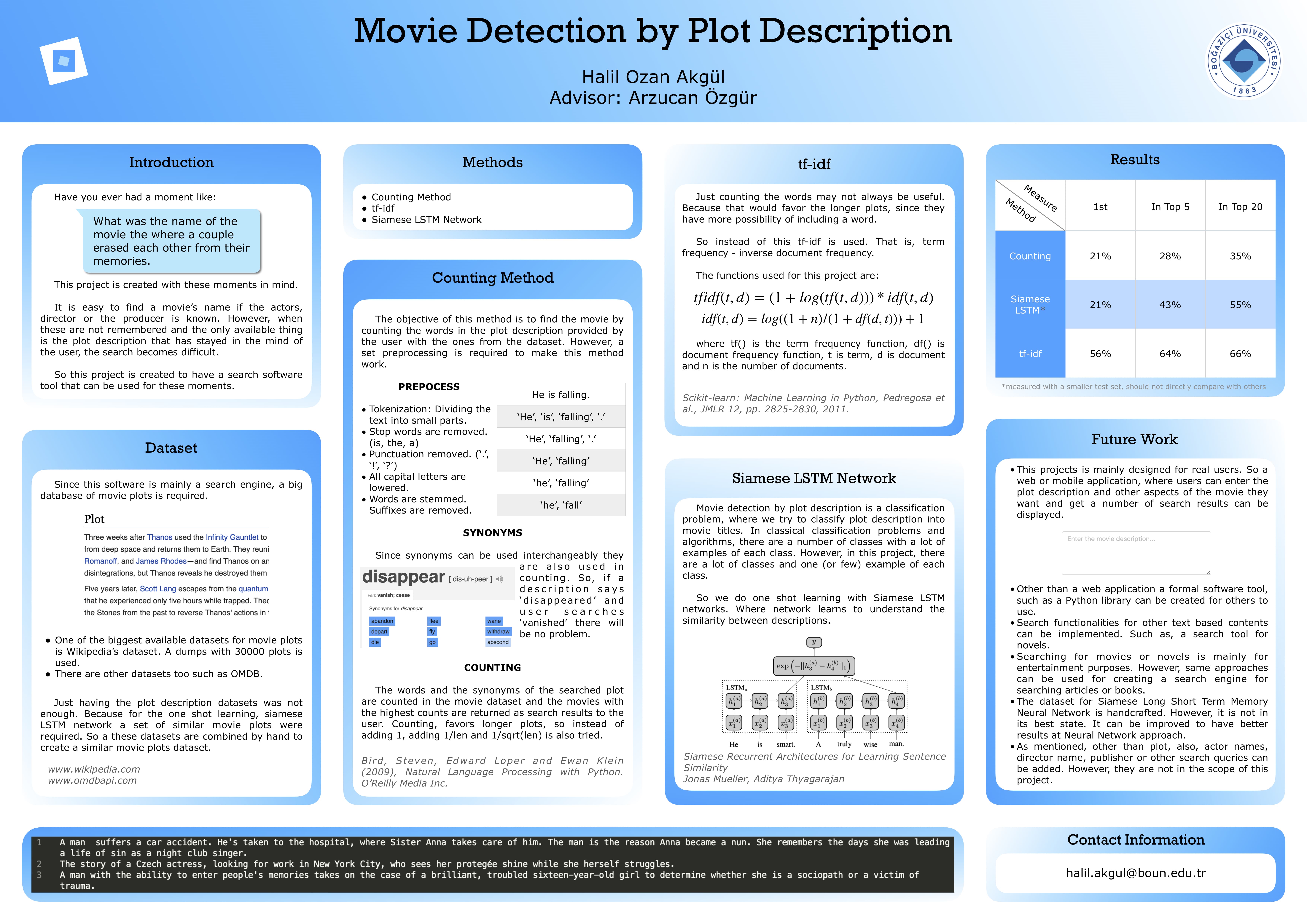 Have you ever had a moment like: 'What was the name of the movie where a couple erased each other from their memories?'. This project is created with moments like this in mind. Aim of the project is to create a software tool that guesses the movie, by looking at the plot description, the user provides. The methods used for this purpose are: Counting Method, Siamese LSTM Network Method and tf-idf Method.