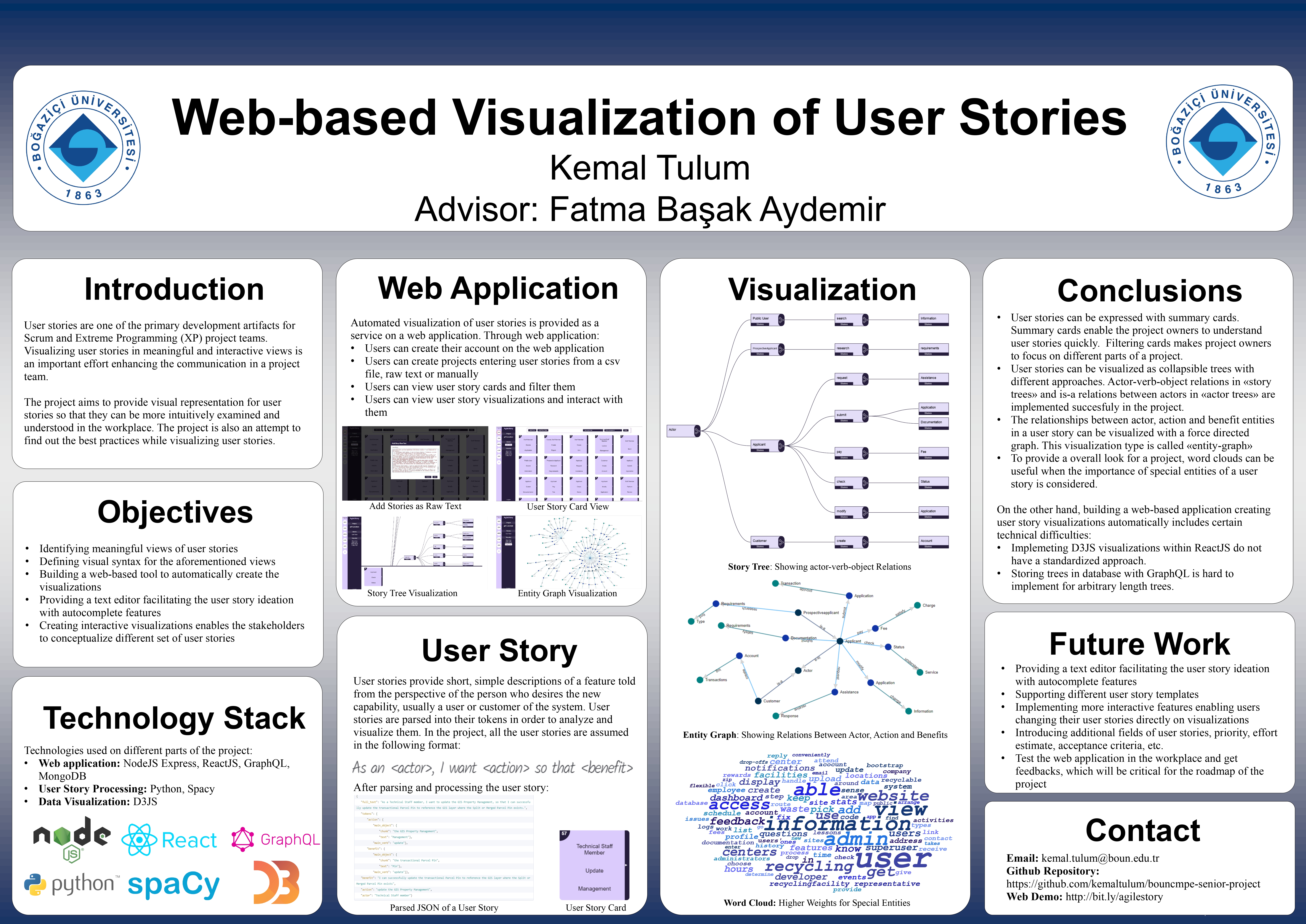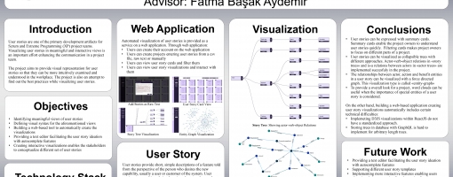 User stories are one of the primary development artifacts for Scrum and Extreme Programming (XP) project teams. Visualizing user stories in meaningful and interactive views is an important effort enhancing the communication in a project team. The project aims to provide visual representation for user stories so that they can be more intuitively examined and understood in the workplace. The project is also an attempt to find out the best practices while visualizing user stories.