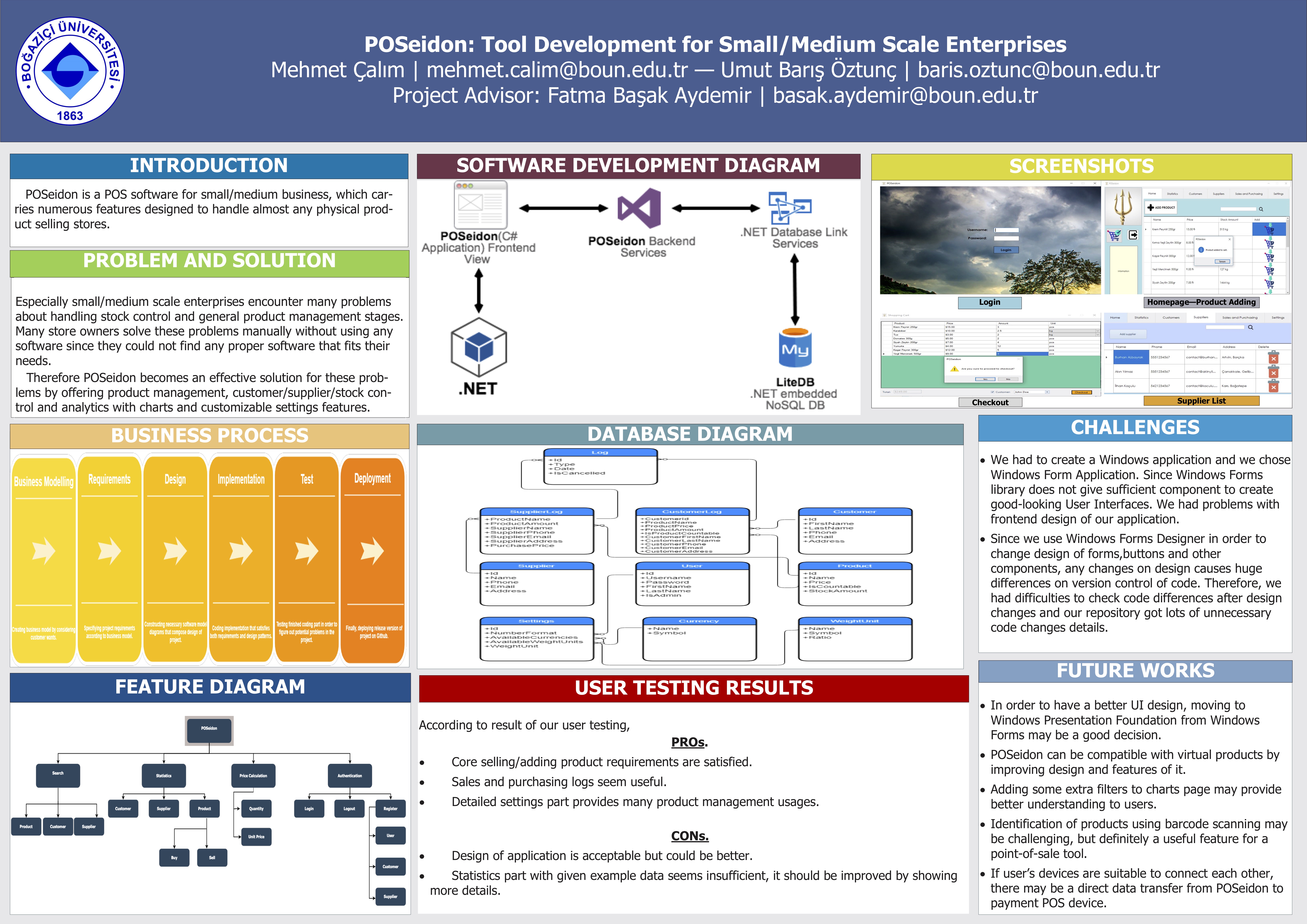 POSeidon is an easy-to-use sales management application that targets small/medium businesses. It stores all the information in its NoSQL database. In addition, its interface is user-friendly and configurable. It allows enterprises to manage their product stock by adding products into the system and controlling products via related statistics with graphs and tables using the dashboard. On the other hand, they can add customers to store and analyse customers' statistics with confidentiality rules. The statistics are available in different formats such as monthly, yearly, product-based, customer-based, and supplier-based. Consequently, POSeidon makes it easier for the enterprises to analyze their sales and investigate their logs.