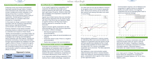 In a recent work (https://arxiv.org/pdf/1911.05282), we let agents to get recommendations from their neighborhood. It was interesting that in some cases getting recommendation is not the best strategy. In this cmpe492 project we would like to further investigate this unexpected behavior.