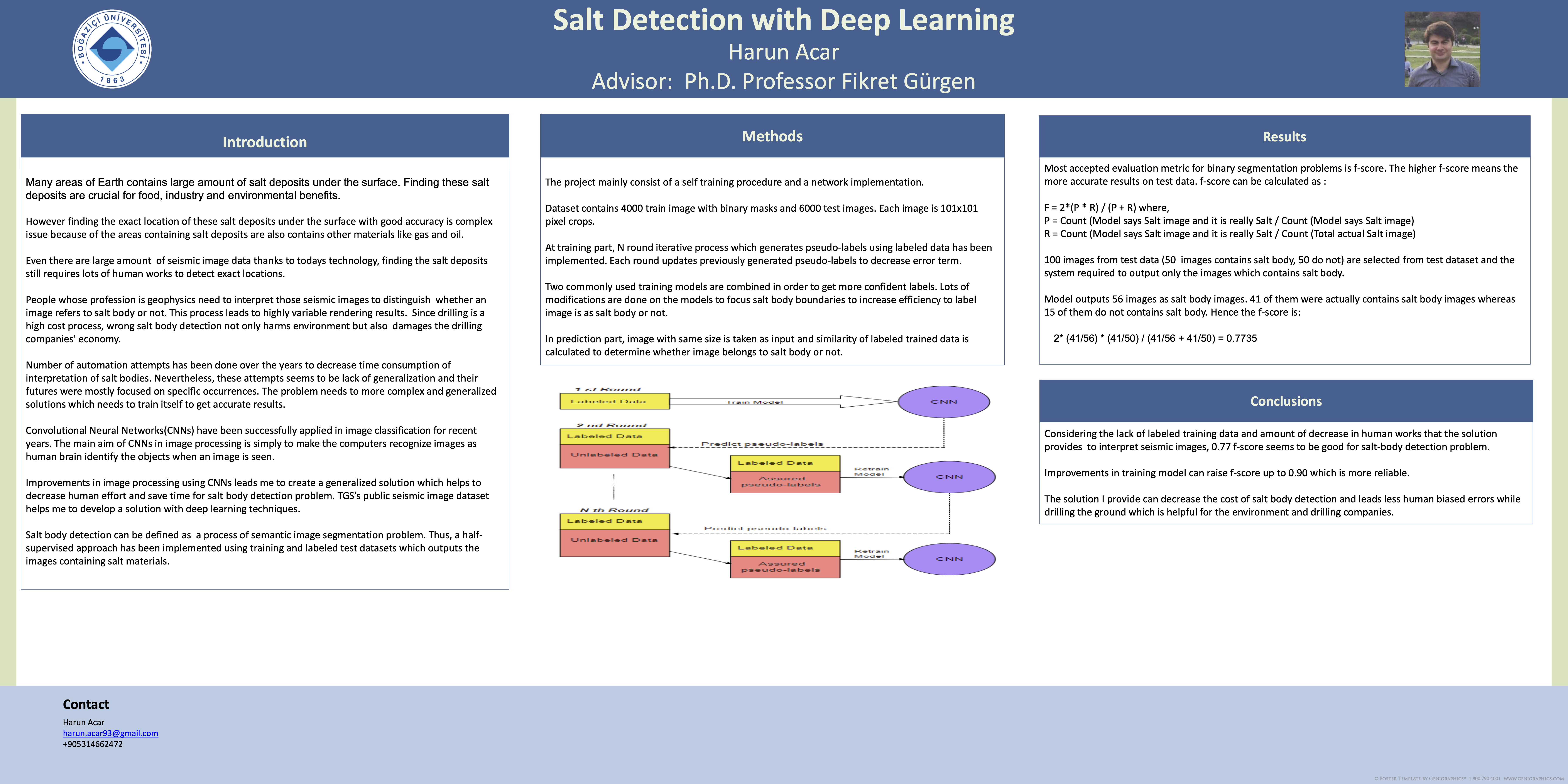 Interpreting seismic images has important role in lots of industry areas it is highly used by people whose profession is geophysics. Salt body detection is time consuming and open to error procedure since it requires identify exact salt material locations under surface using seismic images. Not only it requires high load of human work, but also human bias can lead highly variable renderings. Errors in detecting the salt body locations cause significant damage to both environment and drilling companies. Convolutional neural networks (CNNs) have been successfully applied in image segmentation problems. They can be used for seismic image interpretations. However, lack of labeled data prevents high performance of using existing CNN models in salt body detection. In this project method which is combination of supervised and unsupervised approaches developed to solve the problem. To increase accuracy, I combined two commonly used training models. At project evaluation method outputs salt body images using 100 test seismic images. %77 accuracy achieved. Hence, results can be said as considering lack of labeled data. Project may be a adequate solution to decrease time consumption and human work load during salt body detection process and it may help in both environment and financial issues.