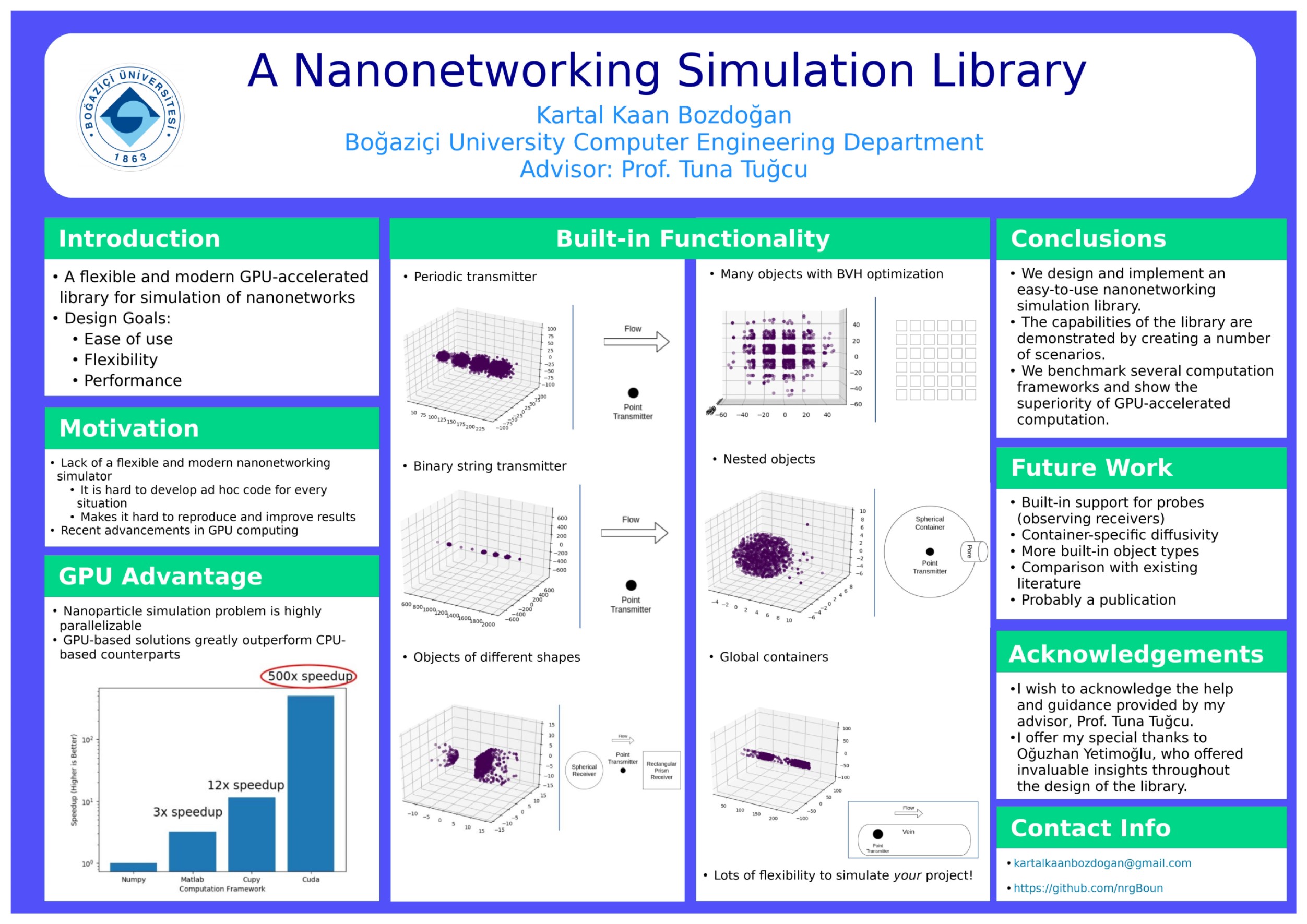 We design and implement a flexible, easy-to-use, high performance, GPU-accelerated nanonetworking simulation library. The library has several built-in object and transmitter types.