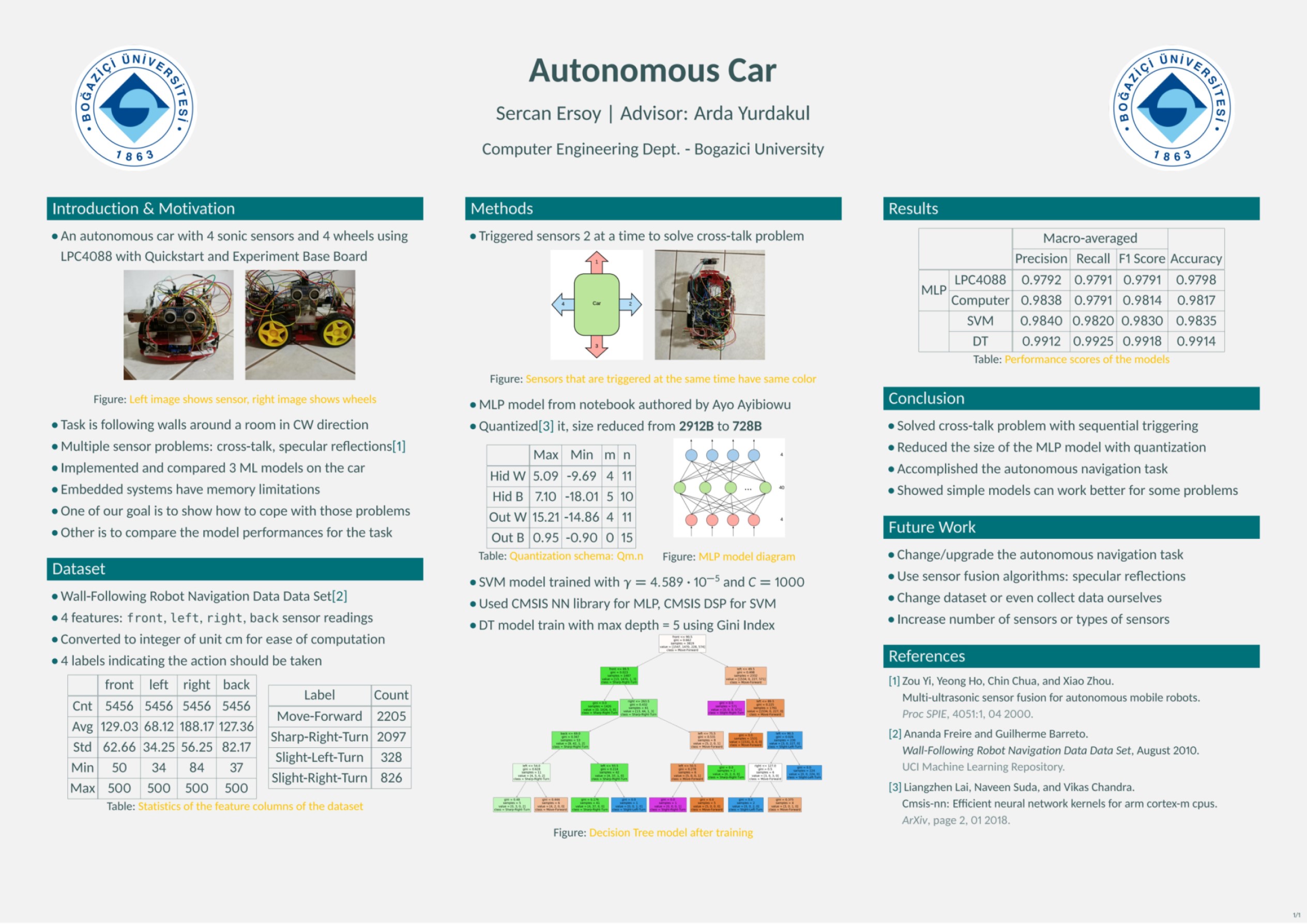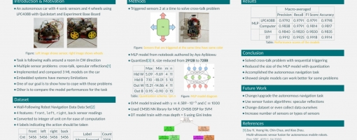We developed autonomous car having 4 sensors and 4 wheels using LPC4088. Task was to follow the room walls in CW direction. Compared MLP, SVM and DT models. Quantized MLP model to make it lightweight.