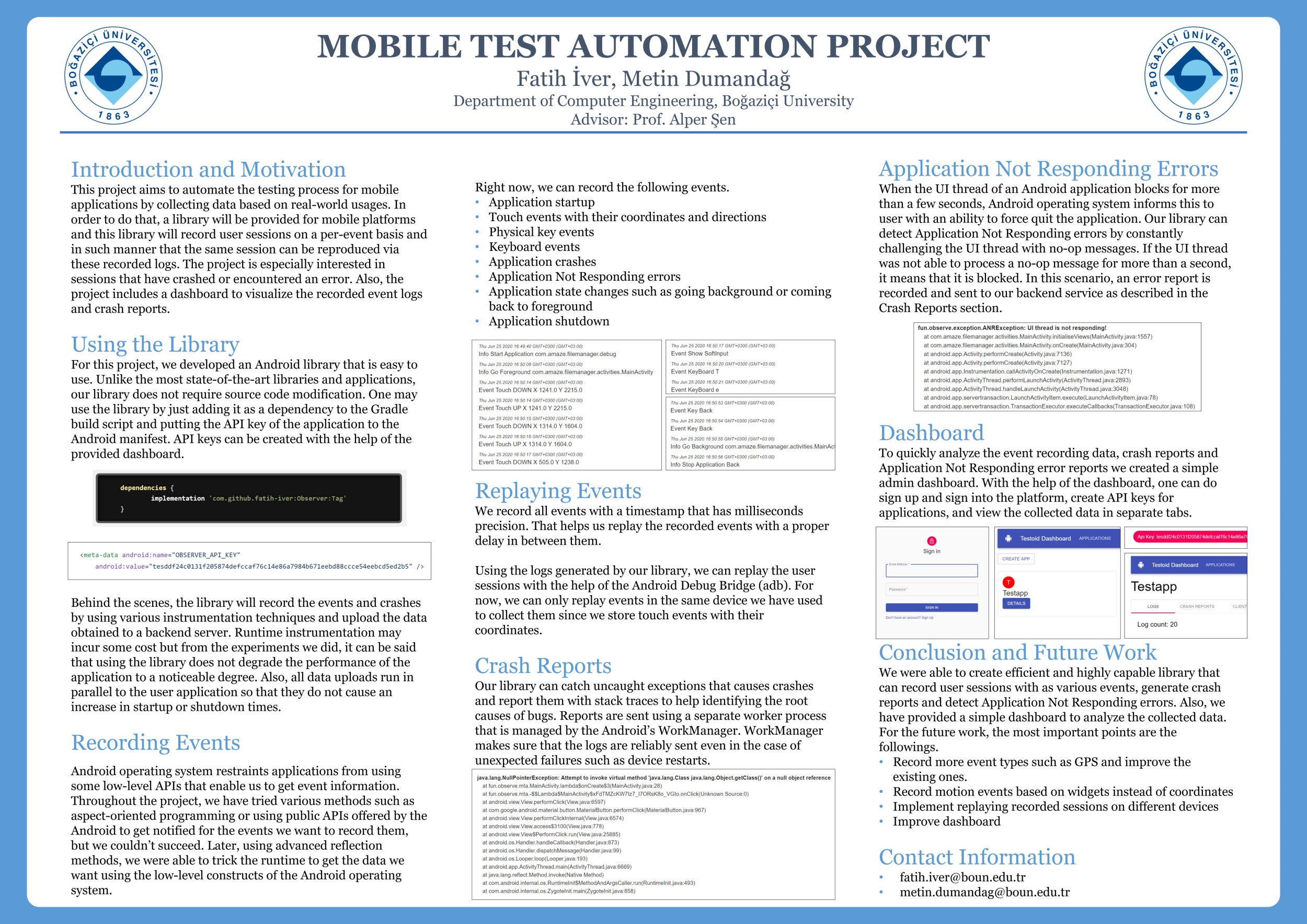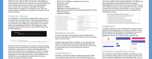 Mobile Test Automation Framework is a project that aims to automate the testing process for mobile applications by collecting data based on real-world usages and then by feeding this collected data to a test generation engine that is based on machine learning. The projects consist of two sub-projects. The first sub-project is responsible for the collection of data. In order to do that, a library will be provided for mobile platforms and this library will record user sessions on a per-event basis and in such manner that the same session can be reproduced via these recorded logs. The project is interested in sessions that have crashed or encountered an error. Thus, with the first project, there will be data about failed sessions, and also with this data, these failures can be reproduced for further examination. The second sub-project will utilize the obtained data in order to generate tests that target real-world usage scenarios. The purpose of the project is to automate testing for mobile applications and having better-targeted tests. This paper will focus on the first sub-project which is the collection of session data and the reproduction of these sessions.