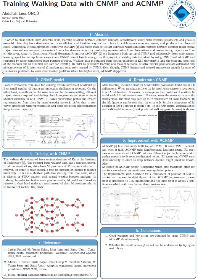 In order to make robots have different skills, learning relations between complex temporal sensorimotor values with external parameters and goals is essential. Learning from demonstration is an efficient and intuitive way for the robots in which robots observes, learns, and produces the observed skills. Conditional Neural Movement Primitives (CNMP) is a recent state-of-the-art approach which can learn relations between complex multi-modal trajectories and environment parameters from a few demonstrations by producing representation from observations and destructuring trajectories from it. Moreover, Adaptive Conditional Neural Movement Primitives (ACNMP) is a framework built on top of CNMP and additionally uses reinforcement learning agent for extrapolation cases where CNMP cannot handle enough. In this project, a walking data is trained by using CNMP and ACNMP and recreated by using conditioned start position of robot. Walking data is obtained from motion database of KIT university and the temporal positions of the markers put on a human are used for learning. In order to generalize learning and make it reusable, relative marker positions are calculated and all components of 3d positions of 53 markers are separately learned by CNMP. Even though, CNMP learned and created trajectories enough for most of the marker positions, to learn some marker positions which has higher error, ACNMP stepped in.