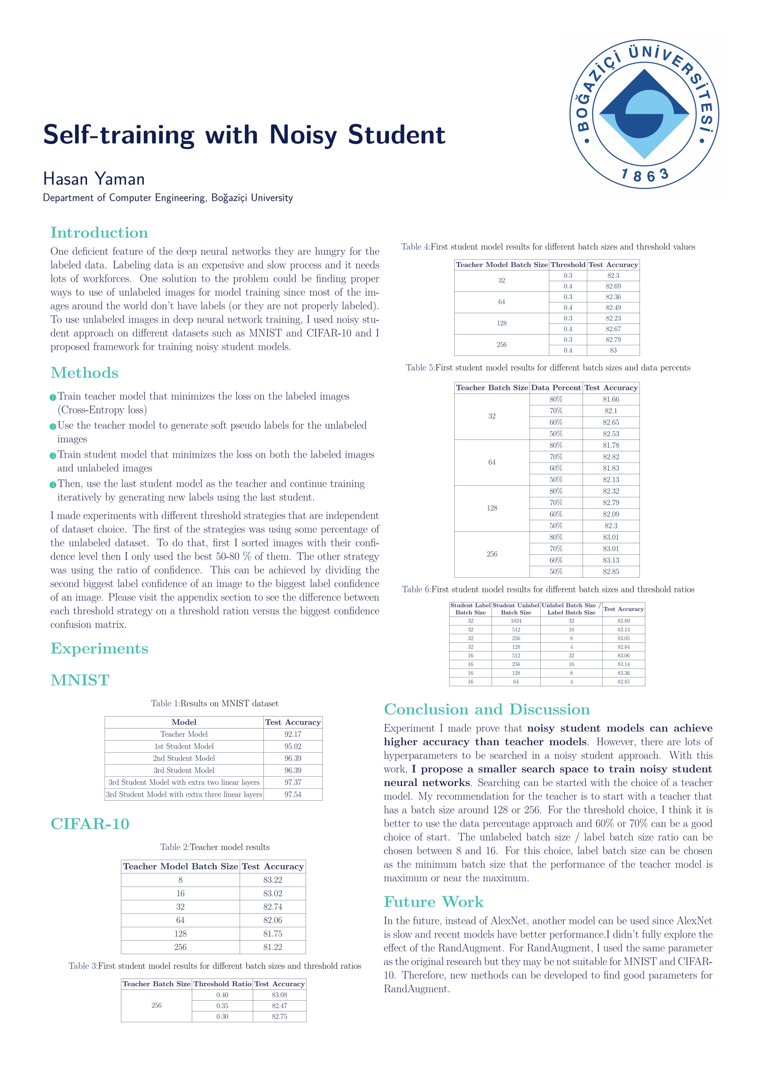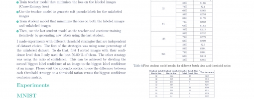 I used a self-training method to improve classification accuracy on CIFAR-10 and MNIST datasets.I proposed a new way of finding hyperparameters for noisy student model that is part of self-training.
