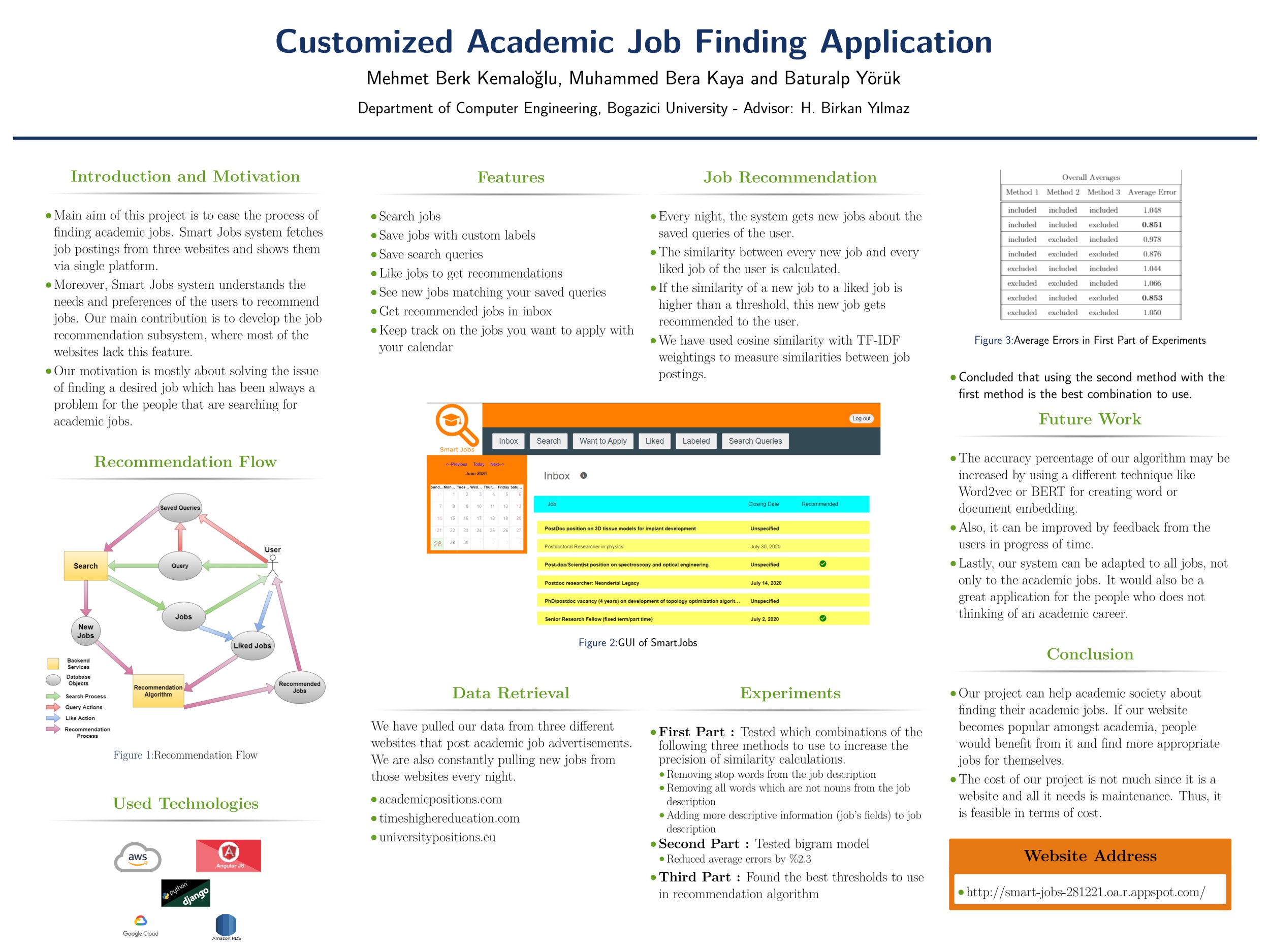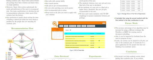 Aim of the project is to ease the process of finding academic jobs. Smart Jobs fetches job postings from three websites and shows them via single platform and recommends jobs according to users likes.