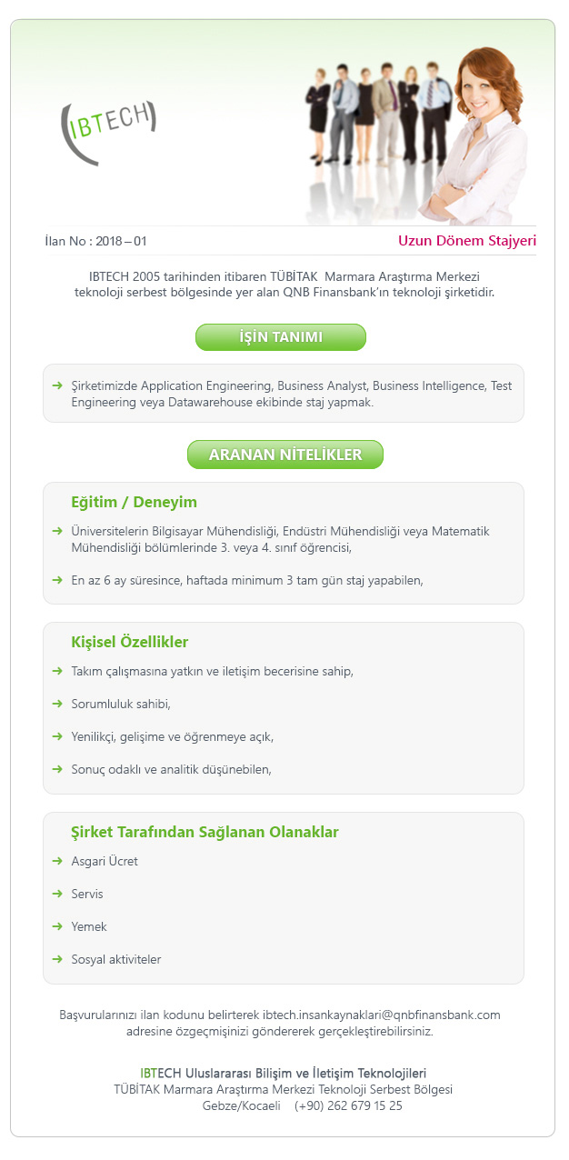 Ibtech Uzun Dönem Stajyer İlanı: Finansbank Bilgi Teknolojileri IBTech, şirket bünyesinde Application Engineering, Business Analyst, Business Intelligence, Test Engineering veya Datawarehouse ekiplerimizde değerlendirilmek üzere 3. ve 4. sınıf stajyer alacaktır. İlan görseli ve detaylı bilgi